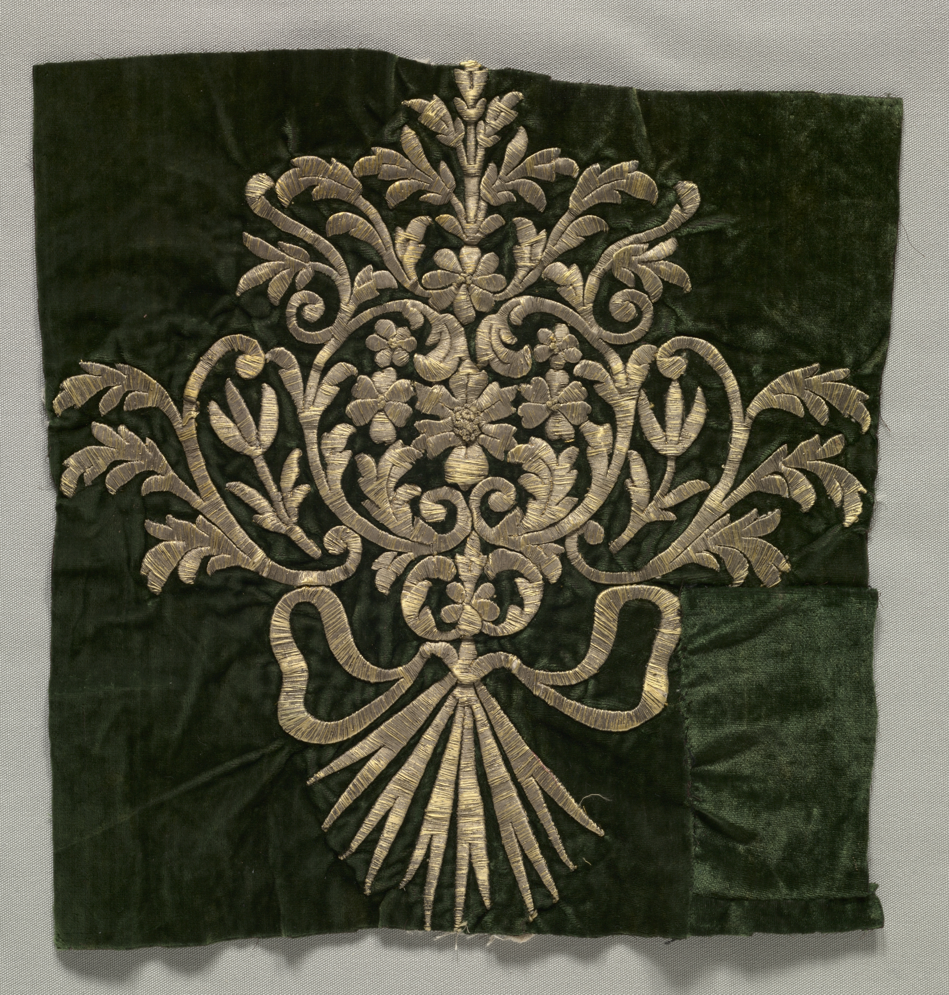 Dark green velvet fabric with a gold embroidered floral design. The design is symmetrical, featuring a central floral motif with curved leaves and stems extending outward. A bow-like element is at the bottom, with long, thin lines radiating from it. The fabric is square, with a slightly wrinkled texture. The background behind the fabric is light gray. Embroidered Fragment by an unknown artist.