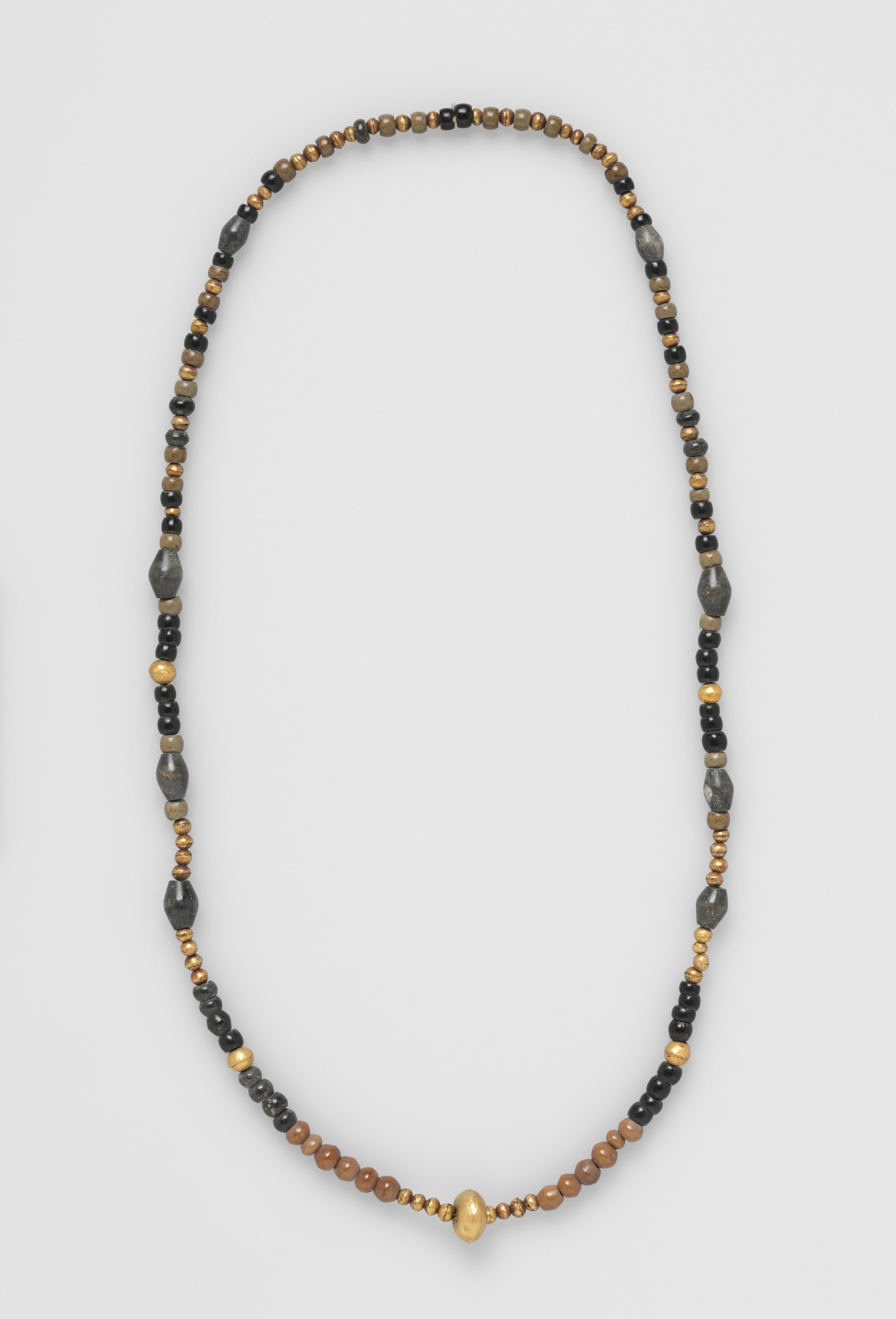 Necklace by Alexander Moroze. A beaded necklace with predominantly black, brown and gold beads. The necklace is composed of various sized beads in different shapes. The majority of the beads are small. There are larger beads spaced throughout the necklace. A large gold bead is centered at the bottom. The beads are spherical or oval. The background is white.