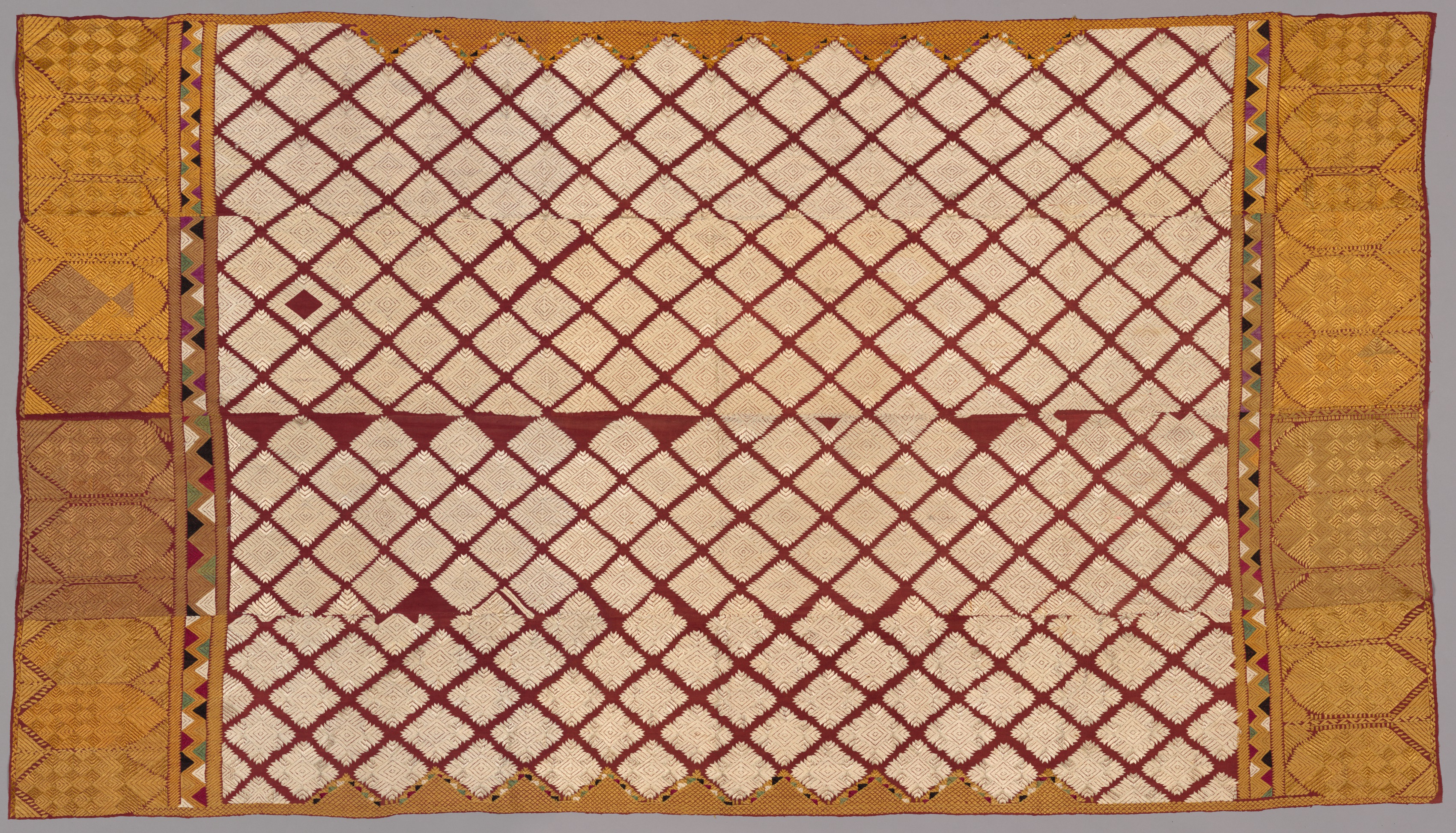 The textile titled "Head Shawl (Phulkari)" by an unknown artist, features a rectangular piece of fabric with a central section and two side sections. The central section has a cream-colored background with a repeating pattern of dark red crisscrossing lines forming diamonds and triangles. The side sections are golden yellow with various shapes and patterns. Narrow strips with small multicolored triangular shapes are on either side, separating the central section from the side sections. The entire piece is rectangular.