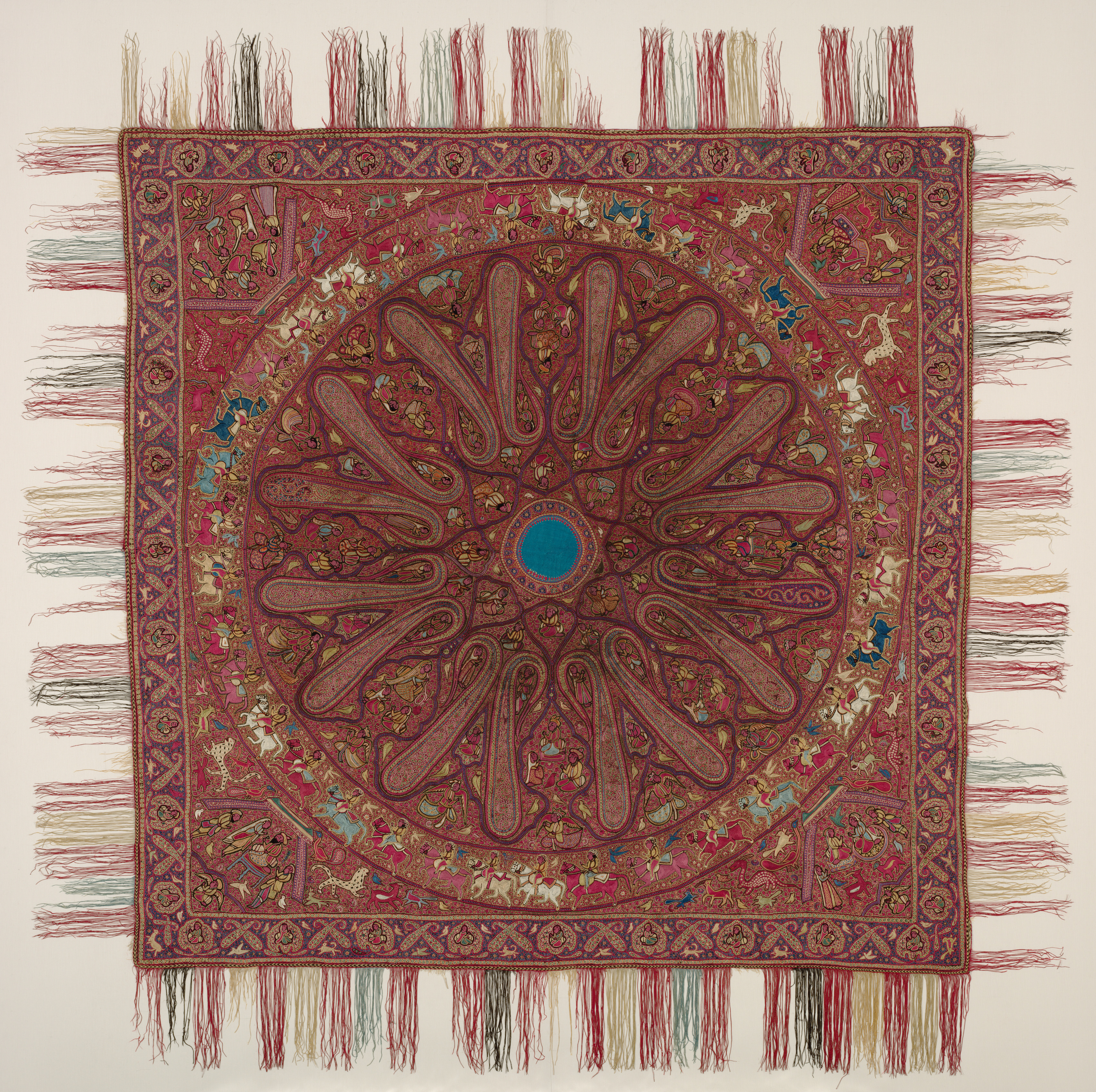 Square shawl with multicolored fringe on all sides; purple-red background with complex circular design in shades of brown; circular design contains animals, including horses, camels, and elephants; surrounded by a blue border with gold designs; and a border of people on horses and other animals. Square Shawl by 19th century Indian artist.