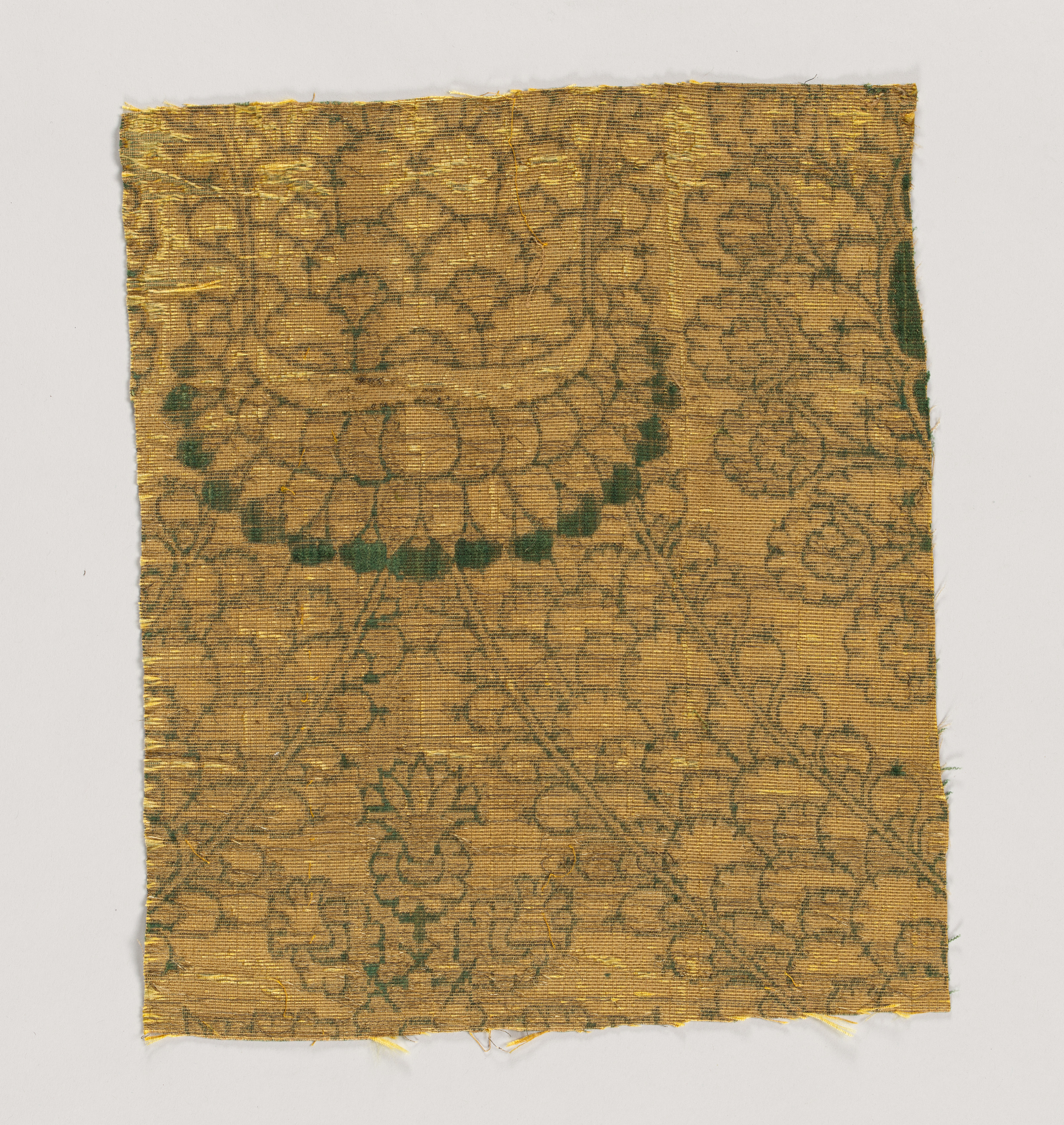 Yellow velvet fabric with green patterning. The fabric is square with frayed edges. The green pattern on the fabric includes a circle with a scalloped edge at the top. The green pattern also includes flowers or other stylized botanical motifs throughout. The background behind the fabric is white. The title is "Velvet Fragments" by an unknown artist.