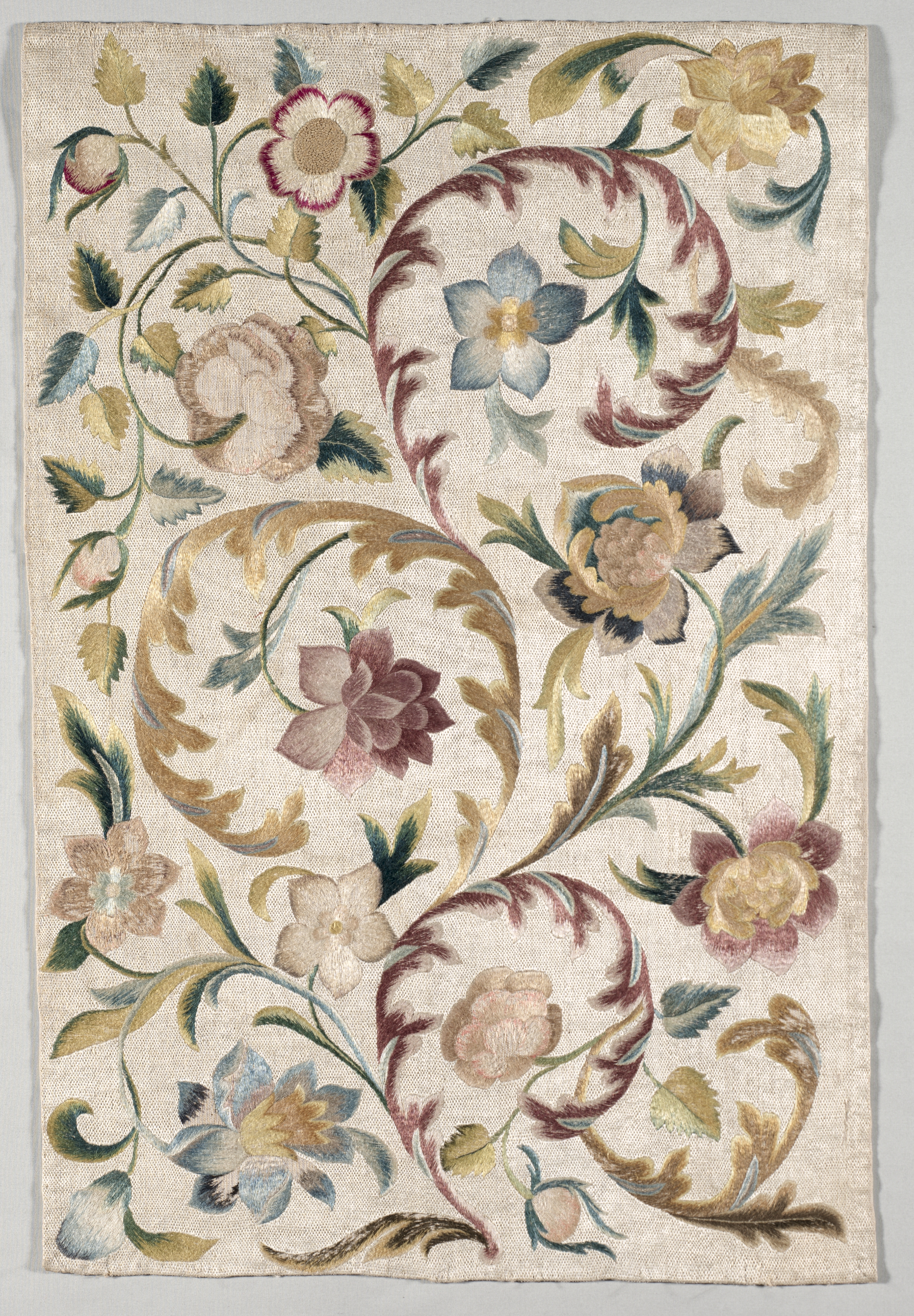 The embroidered panel by artist William Morris features a predominantly cream-colored background. The panel showcases a floral design with various flowers and leaves in shades of blue, yellow, brown, and red. The flowers are intricately connected by curved stems and leaves, creating a sense of movement and flow. The embroidery is densely packed, with little visible background. The overall design is symmetrical, with elements mirrored on either side of a central axis. The panel's edges are slightly frayed, adding to its handmade appearance.