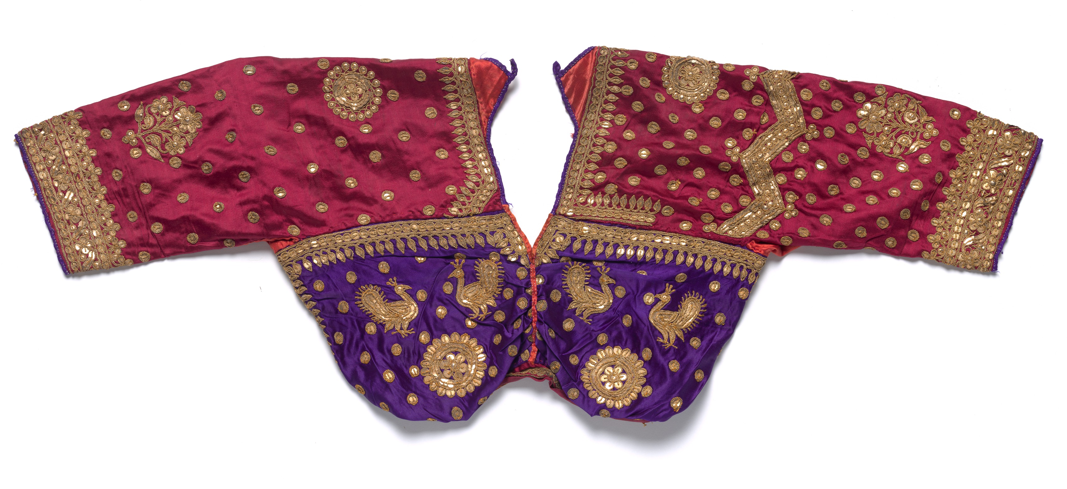 The image shows a Bodice or Coli by artist unknown. Two ornate, short-sleeved pieces of clothing are laid out. The top parts are red with gold embellishments, including dots and floral designs. The bottom parts are purple with gold embellishments, featuring peacocks and circular designs. The two pieces are connected at the bottom. The background is white.