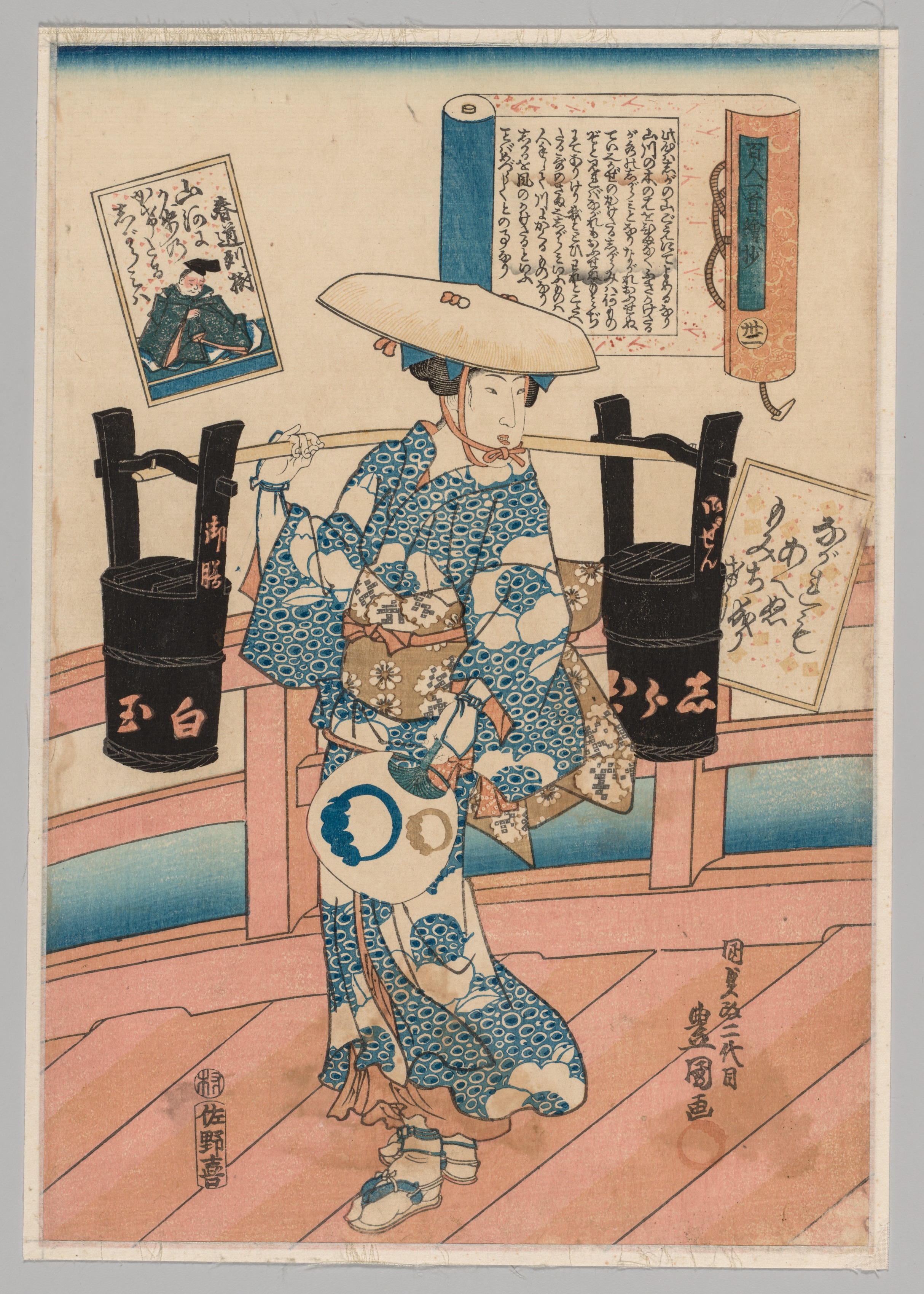 The image depicts a Japanese woodblock print showing a woman in a blue and white kimono. The woman wears a wide-brimmed hat and holds a long pole with baskets on either end. She stands on a wooden floor with her body facing left and looks forward. The kimono has a pattern of circles and flowers. She wears geta sandals. Behind her is a railing with two black containers. A scroll and a rectangular paper with Japanese writing hang on the wall. A smaller picture of a man in a green kimono is also on the wall. The print has a beige background with a blue border at the top. The overall color palette is muted, with shades of blue, beige, and brown.