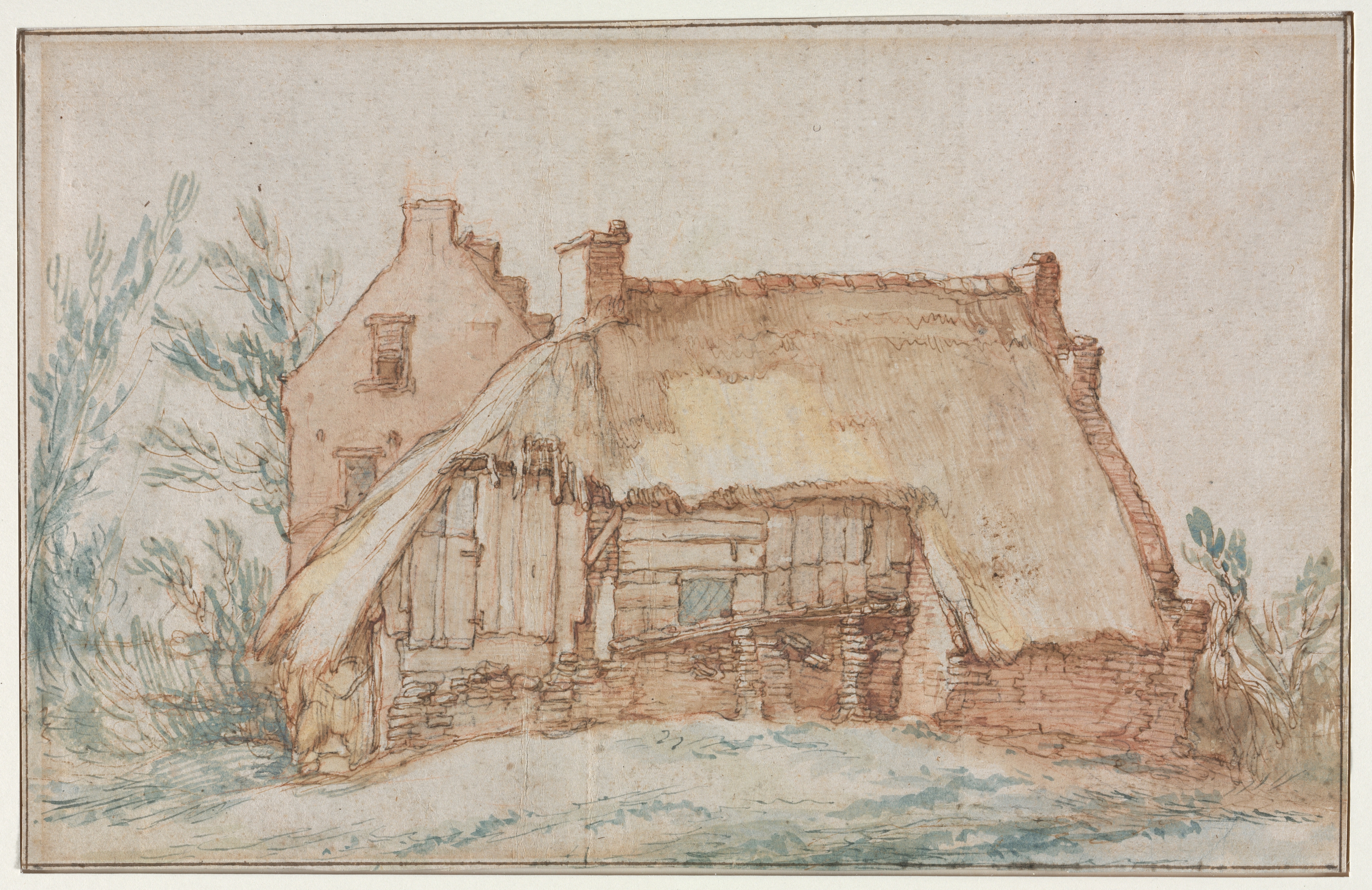 Brown and green drawing of a farmhouse. The house has two sections. The left section is taller with a gable roof. There are two windows on the second story and one window on the first story. A tree to the left of the tall section. The section on the right has a roof made of straw. A chimney on top. A low brick wall in front. A tree to the right. The background is off-white with darker brown lines forming a border.