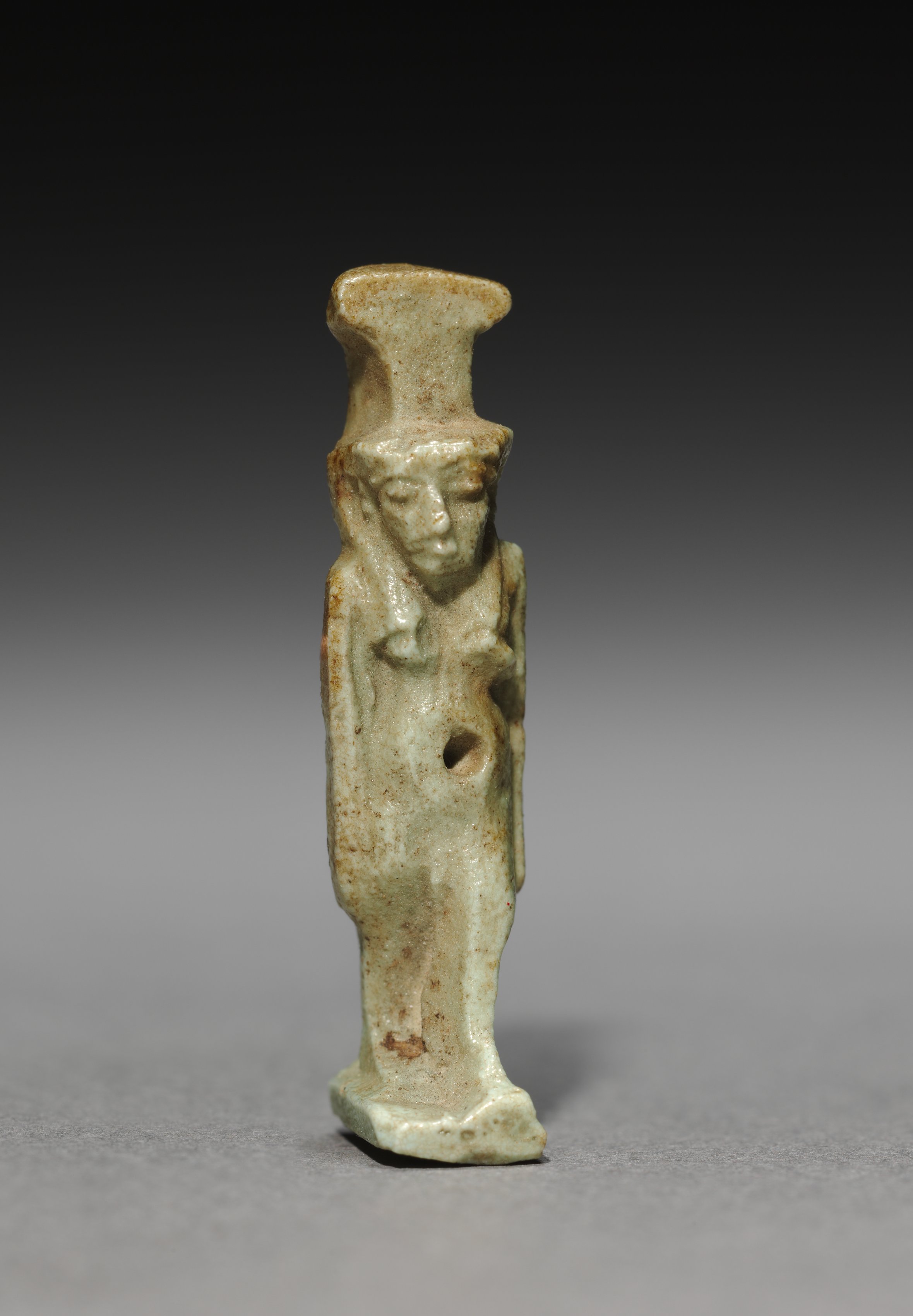 The Amulet of Nephthys by an unknown artist depicts a small, pale greenish-gray ceramic or stone figurine. The figurine features a woman with long hair, wearing a long dress and a distinctive hat or headpiece. The figure has a small hole in the middle of the body. The object has a glossy finish with brown speckles. The background of the image is dark at the top and lightens towards the bottom.