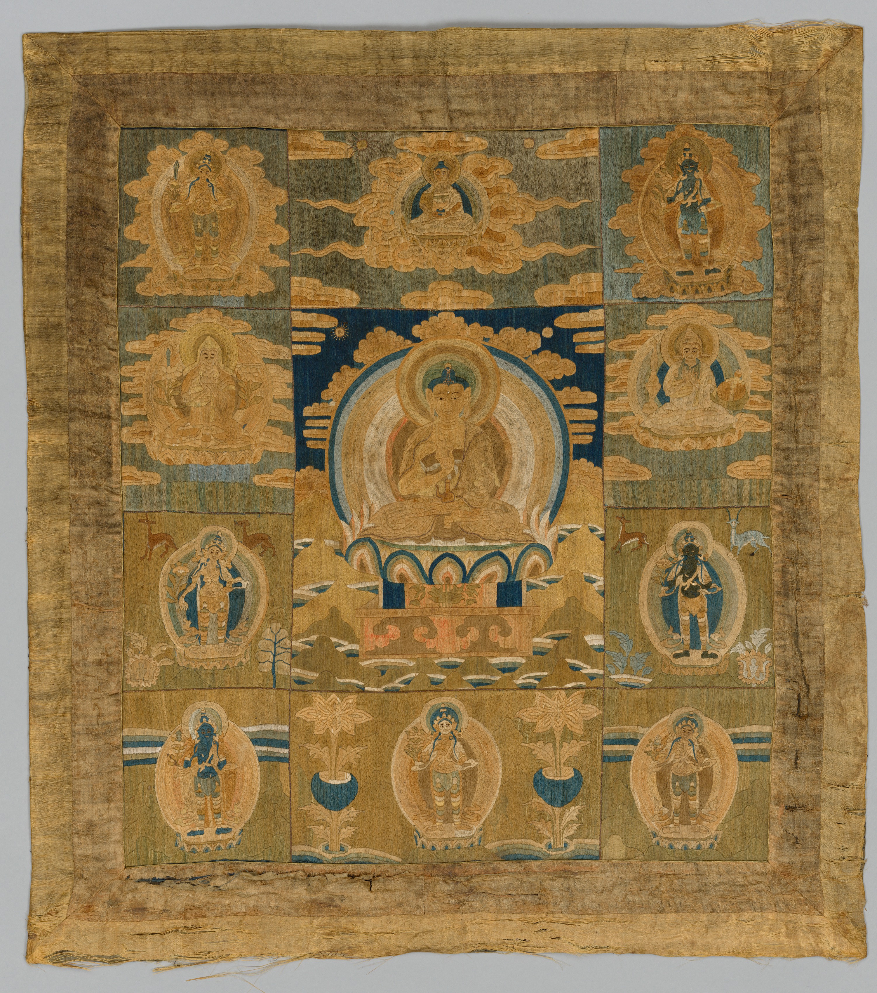 The image depicts a square textile artwork titled "Mandala or Iconographic Panel" by an unknown artist. The artwork features a central figure seated in a lotus position on a throne-like structure, surrounded by a halo. The central figure is positioned on a blue background with gold clouds. The central figure is flanked by four smaller panels on either side, each containing a figure surrounded by a halo. The four top and four bottom panels feature figures standing or sitting in various poses, surrounded by ovals. The background of the artwork is primarily gold with blue accents. The artwork has a worn and aged appearance with a rough, uneven border. The artwork appears to be made of silk or another type of fabric. The overall design is symmetrical. The artwork features a mix of gold, blue, and white colors.