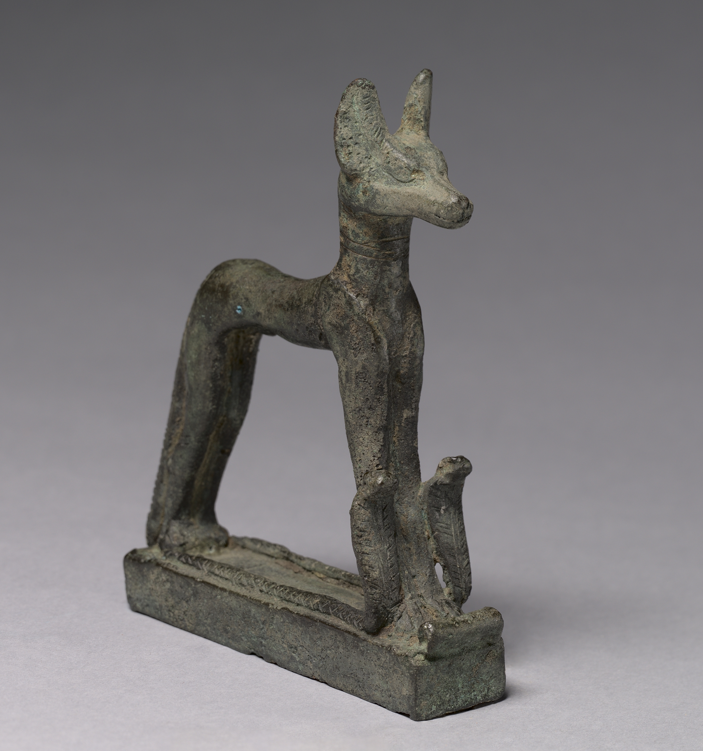 The image depicts a small, weathered statue of a Jackal. The statue is made of dark grey-green metal, possibly bronze or copper, with a rectangular base. The Jackal is standing on all fours, facing right, with its head turned to the right, and its ears pointed upright. Its front right leg and back left leg are visible, while the other two legs are not visible. The statue appears to be ancient, with visible signs of wear and tear. The background of the image fades from dark grey at the top to light grey at the bottom. The statue titled "Jackal" is by an unknown artist.