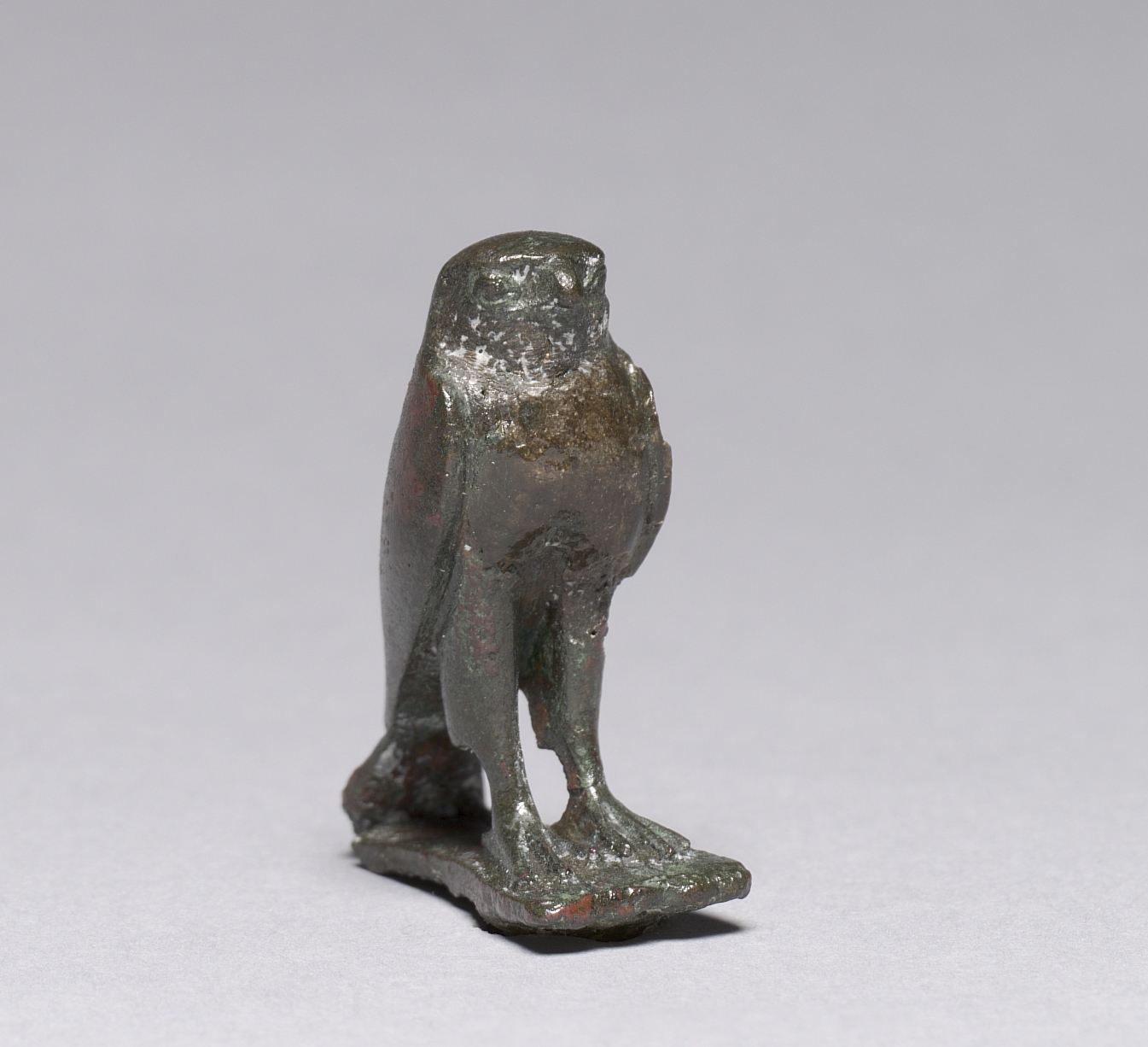 Metal figurine of a falcon, likely made of bronze or copper, with a dark green patina. The figurine is standing on a flat base with two legs. The body and wings are visible. The head is rounded with a short beak. The surface appears worn and weathered. The title of the piece is "Horus Falcon".