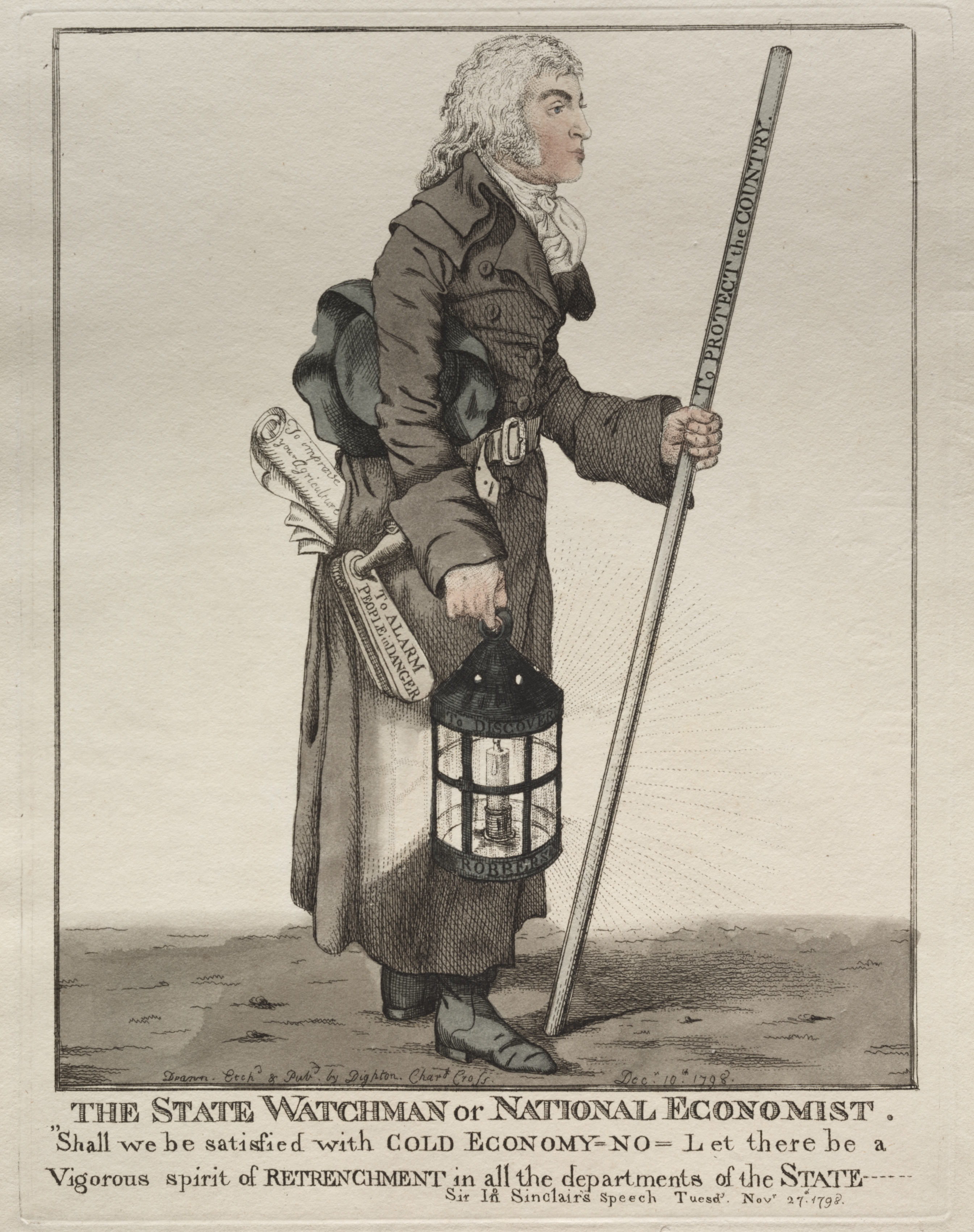 Black and white image of a man with white curly hair wearing a long brown coat with tails, white neck scarf, and black shoes. He holds a lantern in his left hand and a long staff in his right. The lantern has a handle and a glass enclosure with writing on it. The staff reads "The Husbandry of the Country". A bag is slung over his right shoulder. He stands on a brown surface with a beige background. Text below reads "THE STATE WATCHMAN or NATIONAL ECONOMIST. 'Shall we be satisfied with COLD ECONOMY - NO - Let there be a Vigorous spirit of RETRENCHMENT in all the departments of the STATE. Sir J. Sinclair's Speech. Tuesd. Nov. 27. 1792."