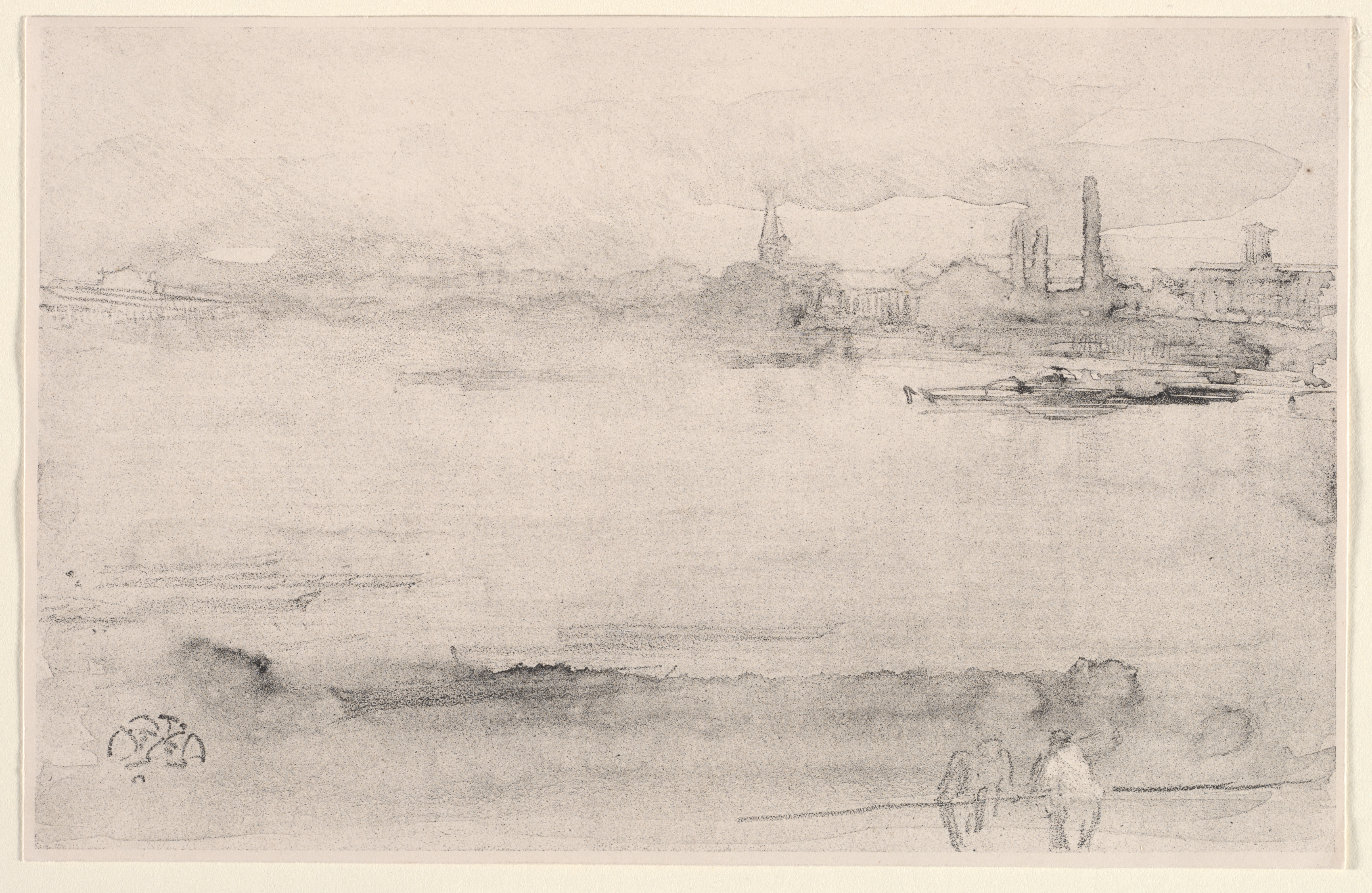 Early Morning by James McNeill Whistler. A grayscale landscape drawing of a river with buildings and a church steeple in the background. A boat is on the water to the right. Two people stand on the shore to the bottom right. The sky above has some clouds. The foreground and midground are lighter in tone than the background. The artwork is presented on a beige background with a slightly darker border around the edges.