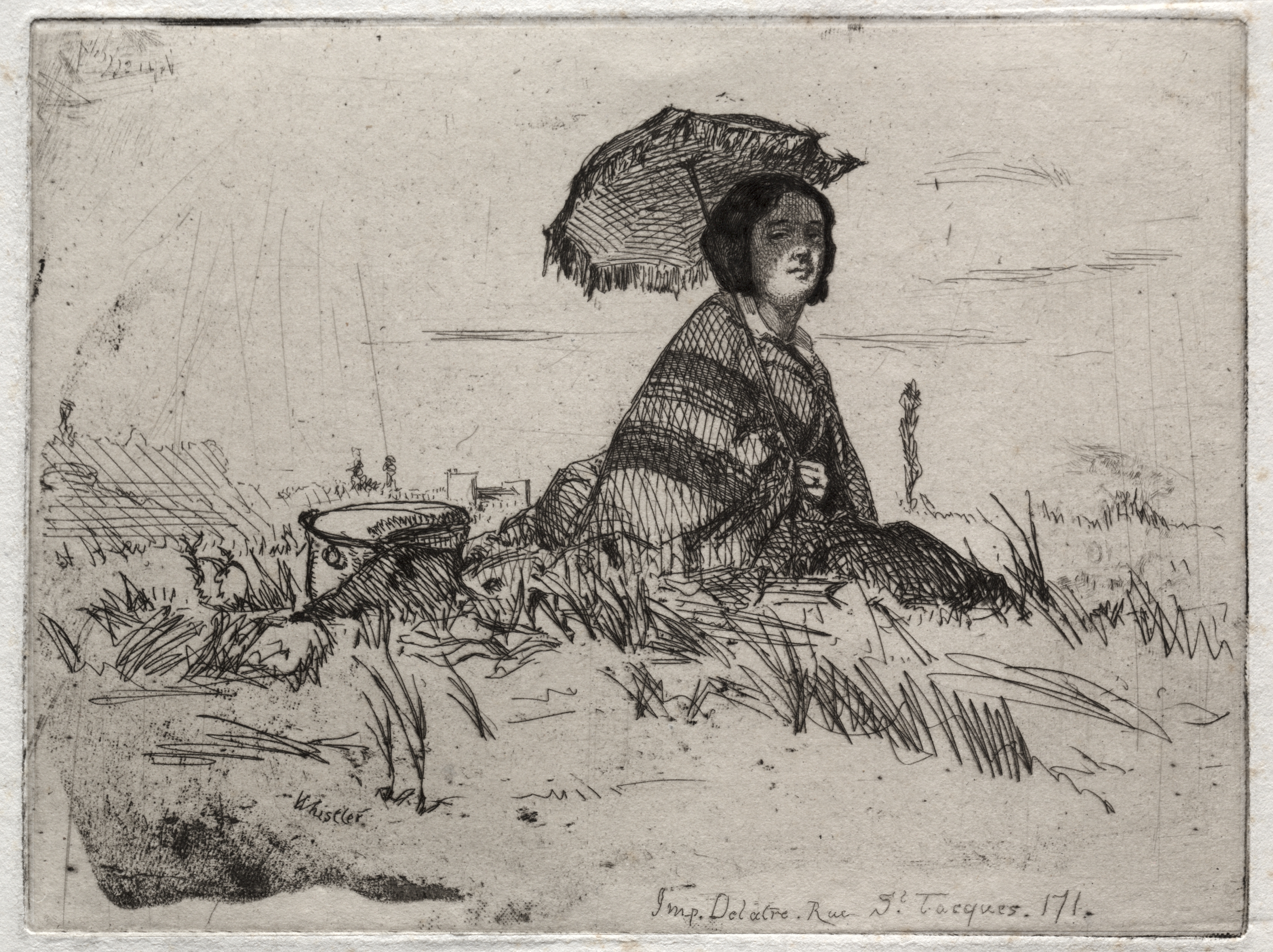 Girl with basket seated on the shore