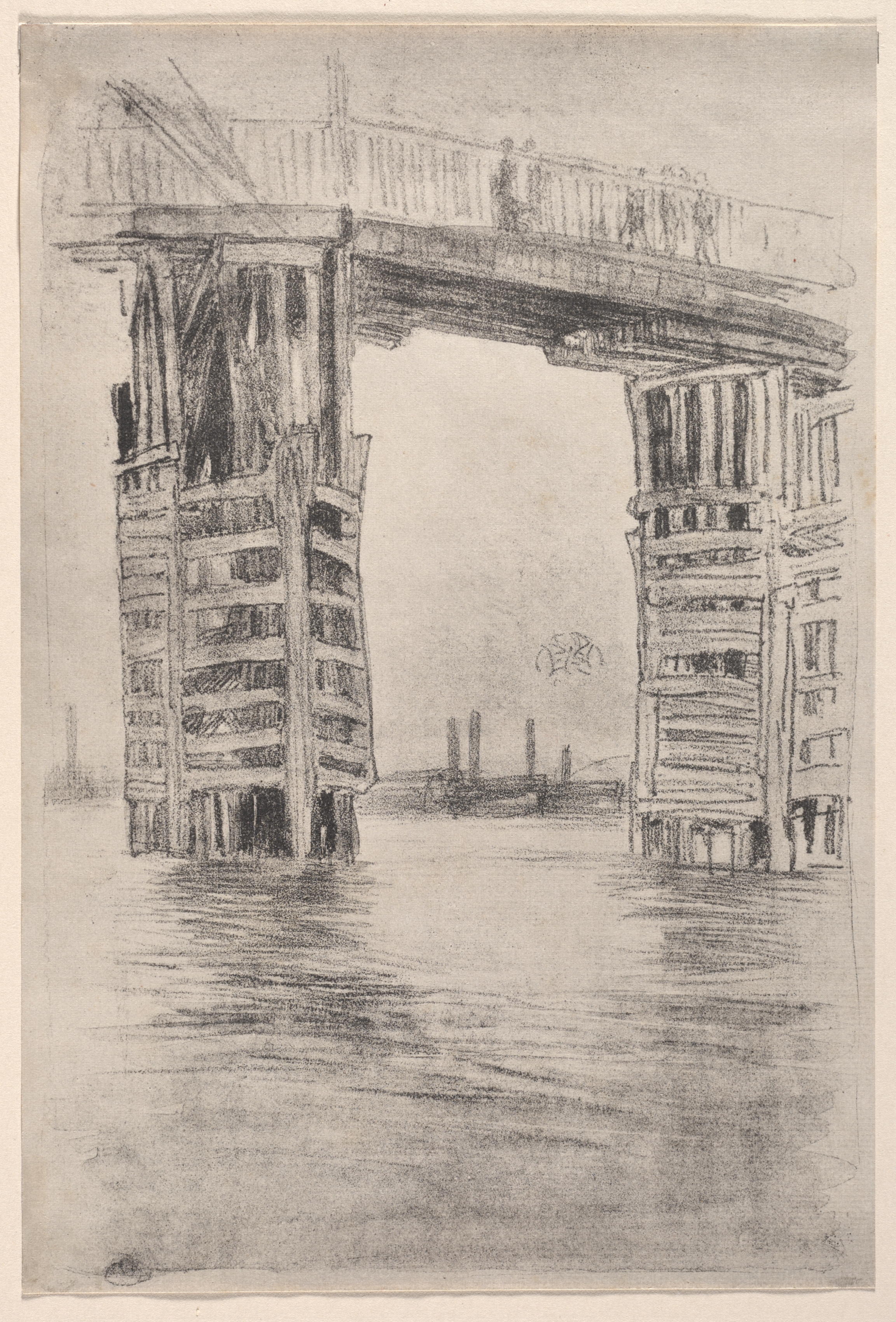 The Tall Bridge by James McNeill Whistler: A pencil drawing on light brown paper depicts a bridge over a body of water. The bridge is composed of wooden supports on both sides leading to a flat portion. The two wooden structures are rectangular with horizontal and diagonal slats. The tall rectangular structures are reflected on the water surface. The background shows a flat horizon line.