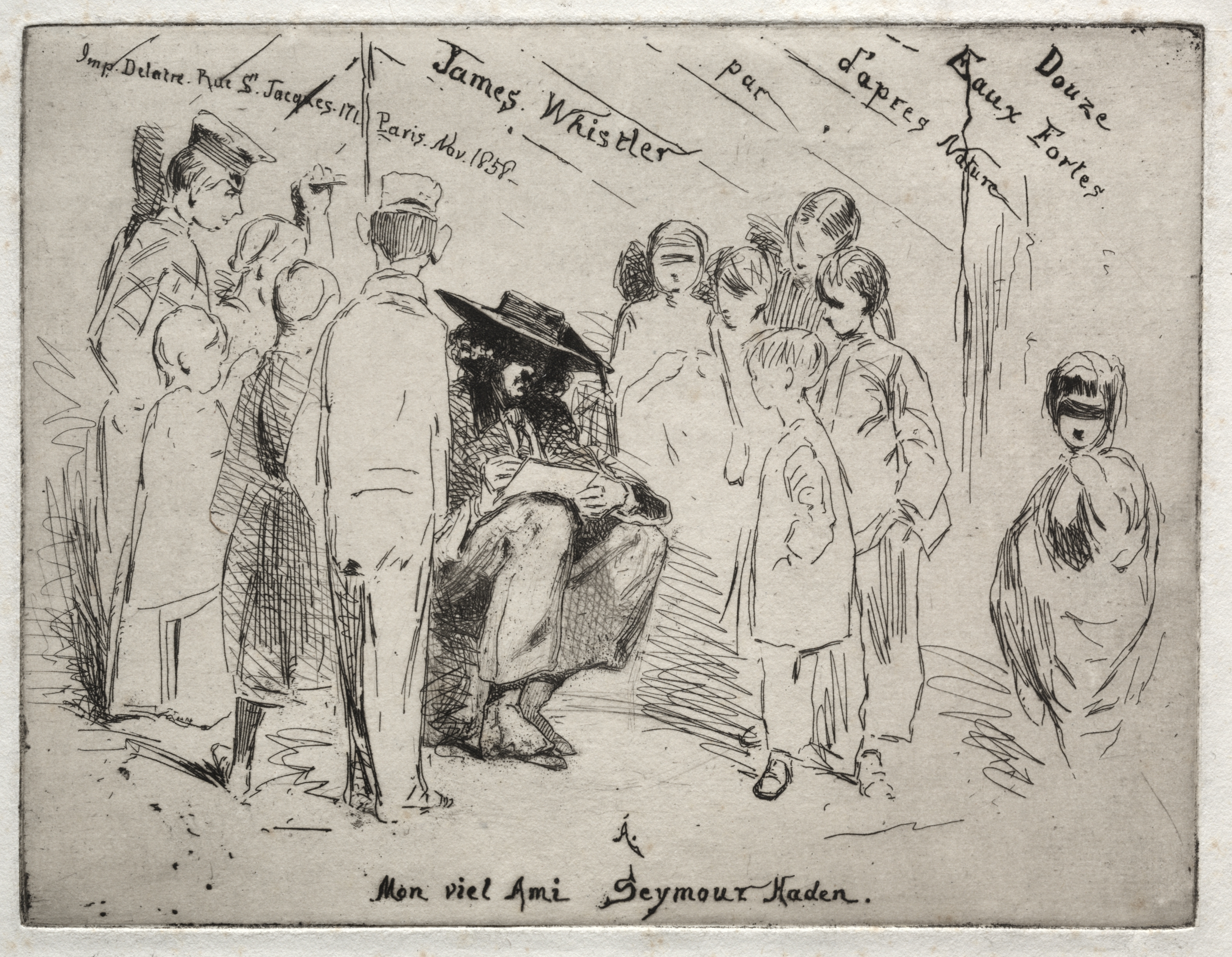 Black and white sketch on a gray background. A group of people surrounding a seated figure, with one standing to the left wearing a military-style hat. The seated figure wears a wide-brimmed hat and long coat. Writing in black ink appears in several spots including top center "James Whistler", top right "Doure Eaux Fortes", bottom center "Mon viel Ami Seymour Haden".