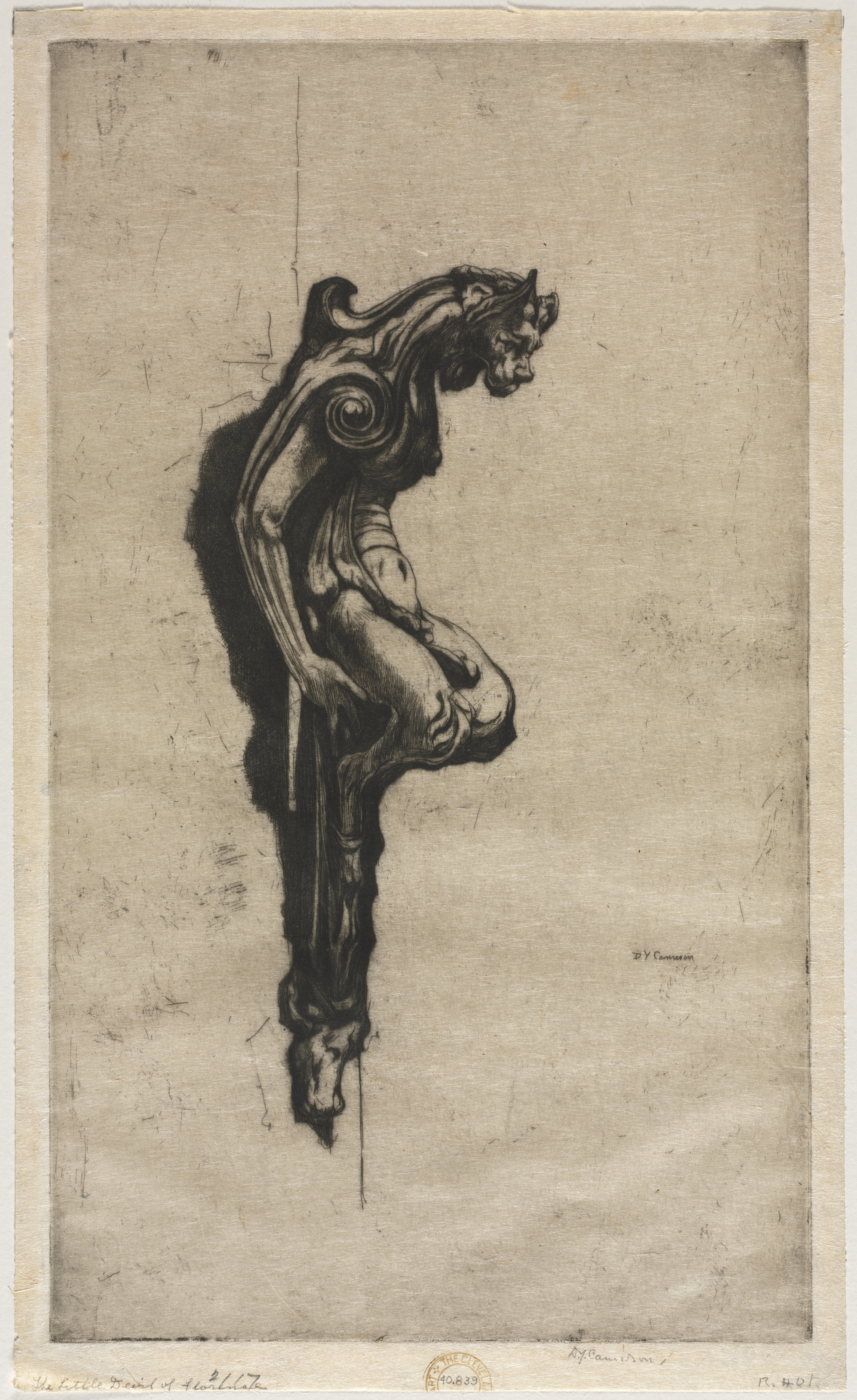 The Little Devil of Florence by David Young Cameron: A black and white drawing of a grotesque stone carving of a man with a beard and long hair on the right side. The figure has one leg bent up in front of him and the other leg extended down. He appears to be emerging from a curled piece of ornate stone that resembles a leaf or scroll. The drawing is in a monochromatic sepia tone with darker shading around the edges of the figure. The background of the piece is light tan with darker scratches and marks throughout. The image is framed by a light border around the edges.