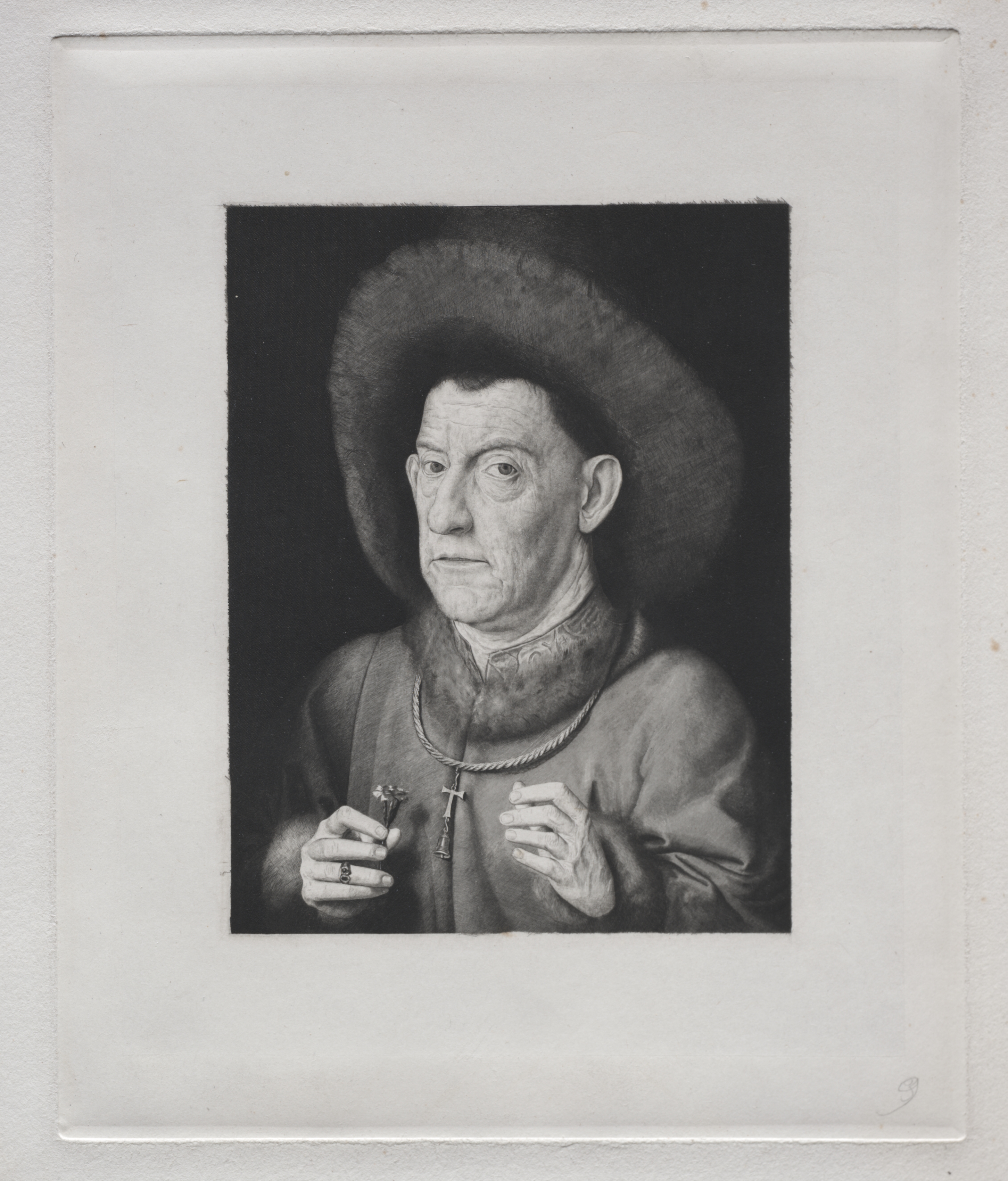 Man with a Pink by Claude-Ferdinand Gaillard. Black and white image of a man wearing a wide-brimmed hat. The man has a serious expression and looks to his right. He wears a high collar and a cord around his neck with a cross. He holds a pink flower in his right hand and has his left hand raised. The man wears a ring on the fourth finger of his right hand. The image has a white border around it. The background behind the man is dark.