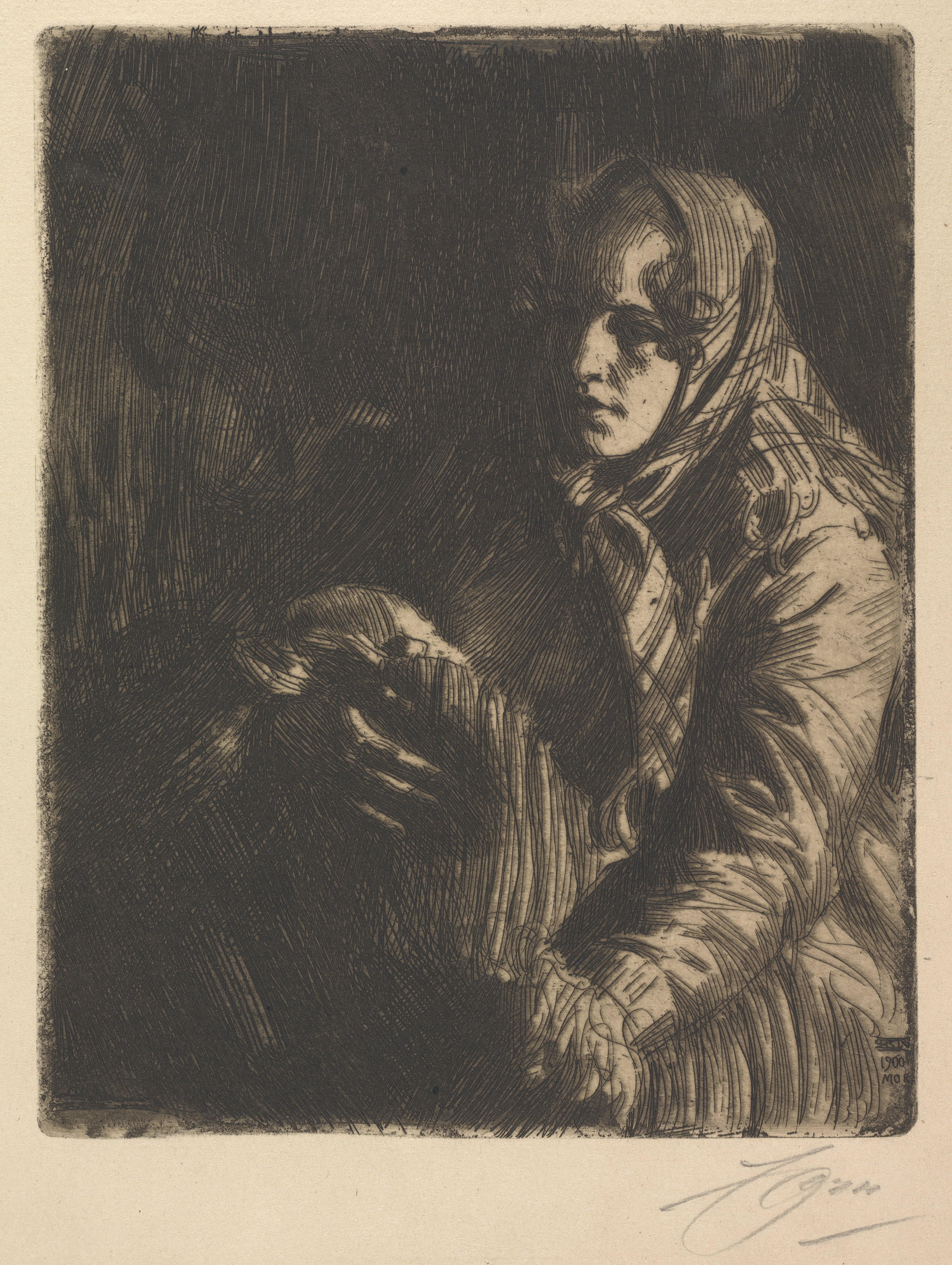 The image depicts a black and white etching of a woman, titled "Madonna" by Anders Zorn. The woman is positioned on the right side of the image, facing left. She wears a headscarf that covers her hair and neck. Her facial features include a nose, mouth, and eyes; her eyebrows are not distinctly visible. The woman's attire consists of a long-sleeved garment with folds and creases; her hands are positioned in front of her. The background is dark, with visible lines and shading throughout the image. The artwork features a signature at the bottom right. The image has a light-colored border around the etching.