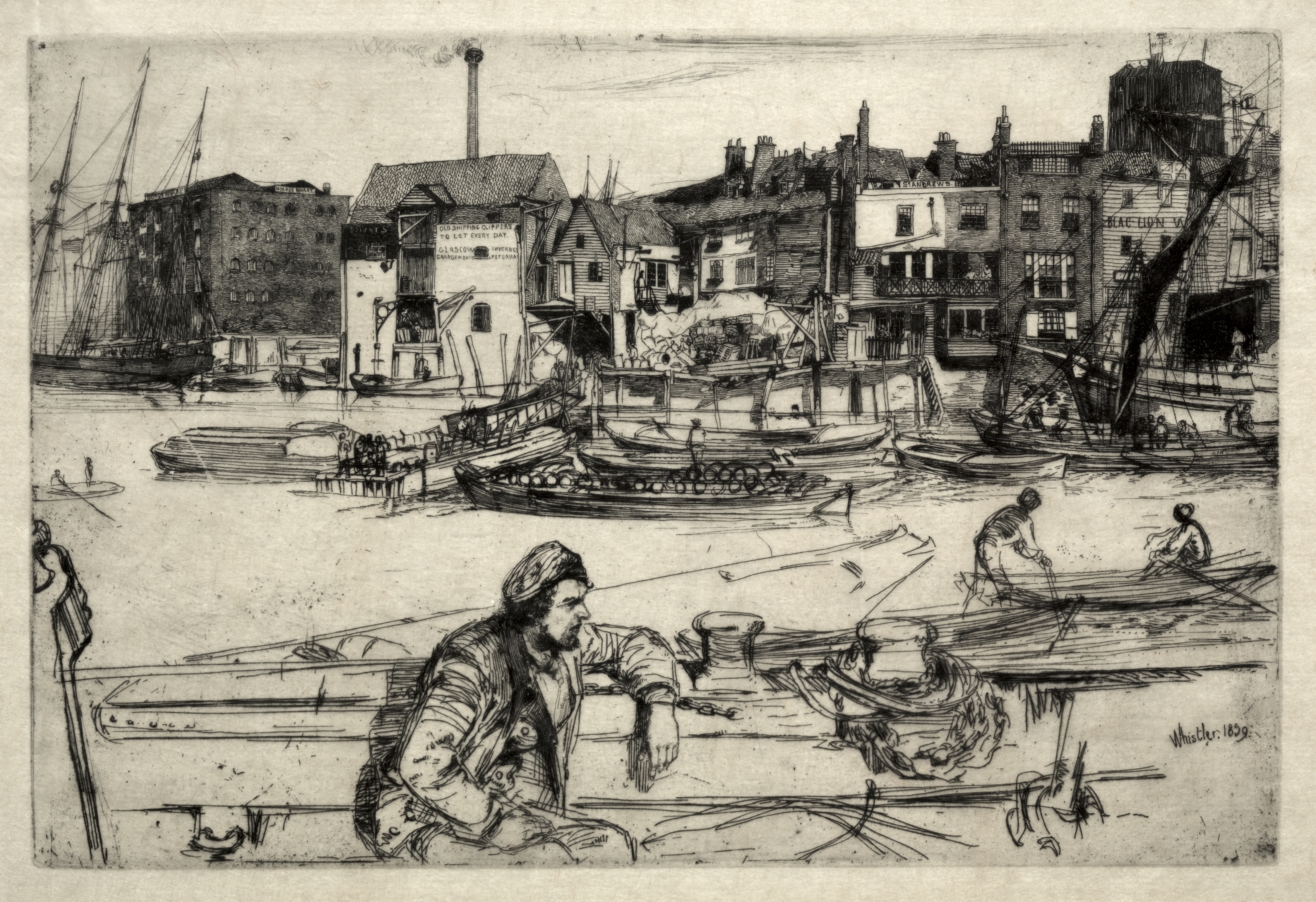 Black Lion Wharf by James McNeill Whistler. A harbor scene with a man sitting on a boat in the foreground. The man has a beard and wears a hat. He sits on a boat with his right elbow on his right knee. Behind him, two men are on another boat. Several boats are in the water. There are buildings and a smokestack in the background. Masts of ships are visible on the left. The buildings have chimneys and signs. The sky is light. The image is in black and white.