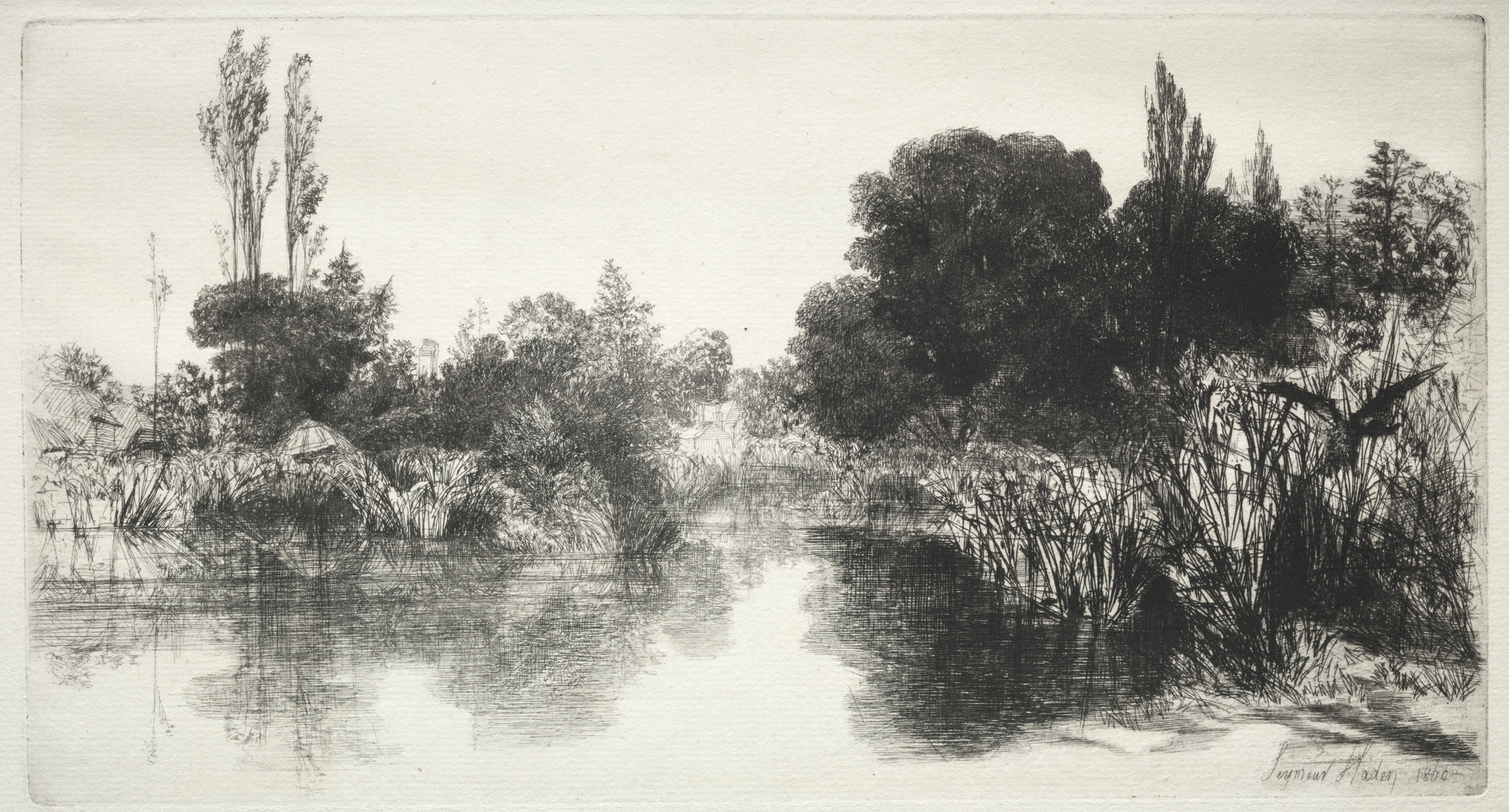 Black and white landscape etching of a pond with trees and vegetation on both sides, water reflecting the sky and trees. The right side has a dense cluster of dark trees and tall grasses. The left side has sparse tall trees and a building in the distance. The artist's signature is in the bottom right corner. The image is titled "Shere Mill Pond (The Larger Plate)" and is by Francis Seymour Haden.