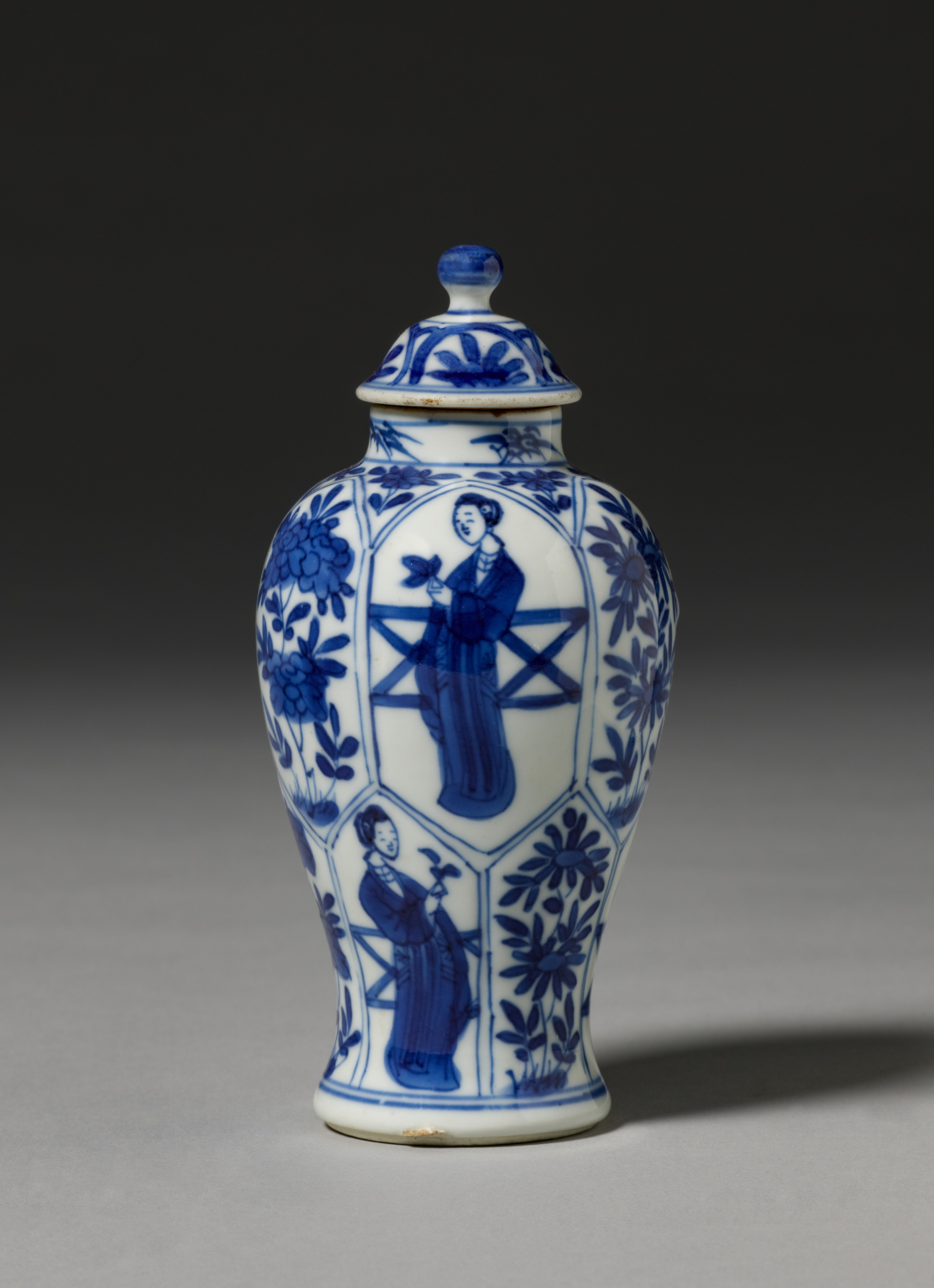 White ceramic jar with blue floral and figurative design. Jar has a narrow base that widens then tapers in to a narrow neck. Shoulder of jar is widest point. Body of jar decorated with a series of octagonal panels. The panels alternate between figurative and floral designs. The figurative designs depict people wearing long robes. Floral designs depict stylized flowers with five or more rounded petals. A small finial on top of lid. Lid and body of jar have matching designs. Small chips on base.