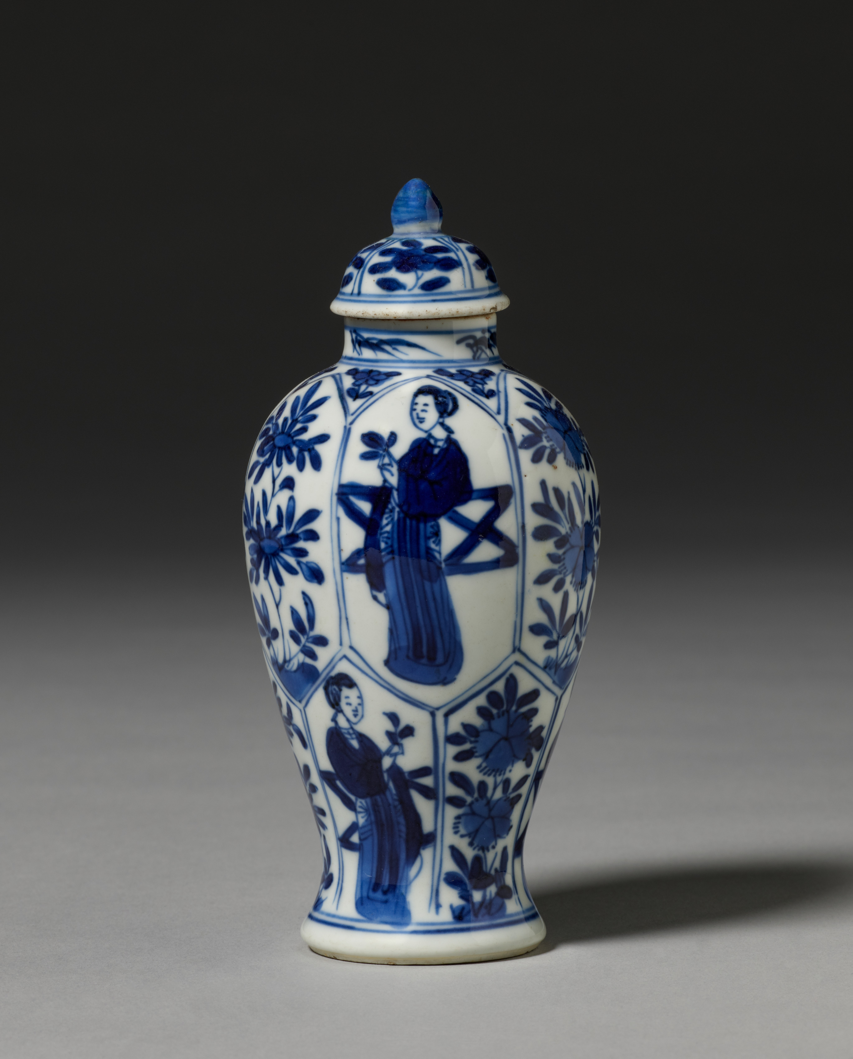 White porcelain jar with blue floral and figurative design. The body of the jar is decorated with a series of panels depicting people and floral motifs. The cover is also decorated with a floral pattern and has a small finial on top. The jar's shape is bulbous with a narrow neck and a flared mouth. The base of the jar is small and rounded. The background of the image is dark gray, with a light source coming from the right side. The jar casts a shadow to the right. The title of the piece is "Jar with Cover". The artist is unknown.