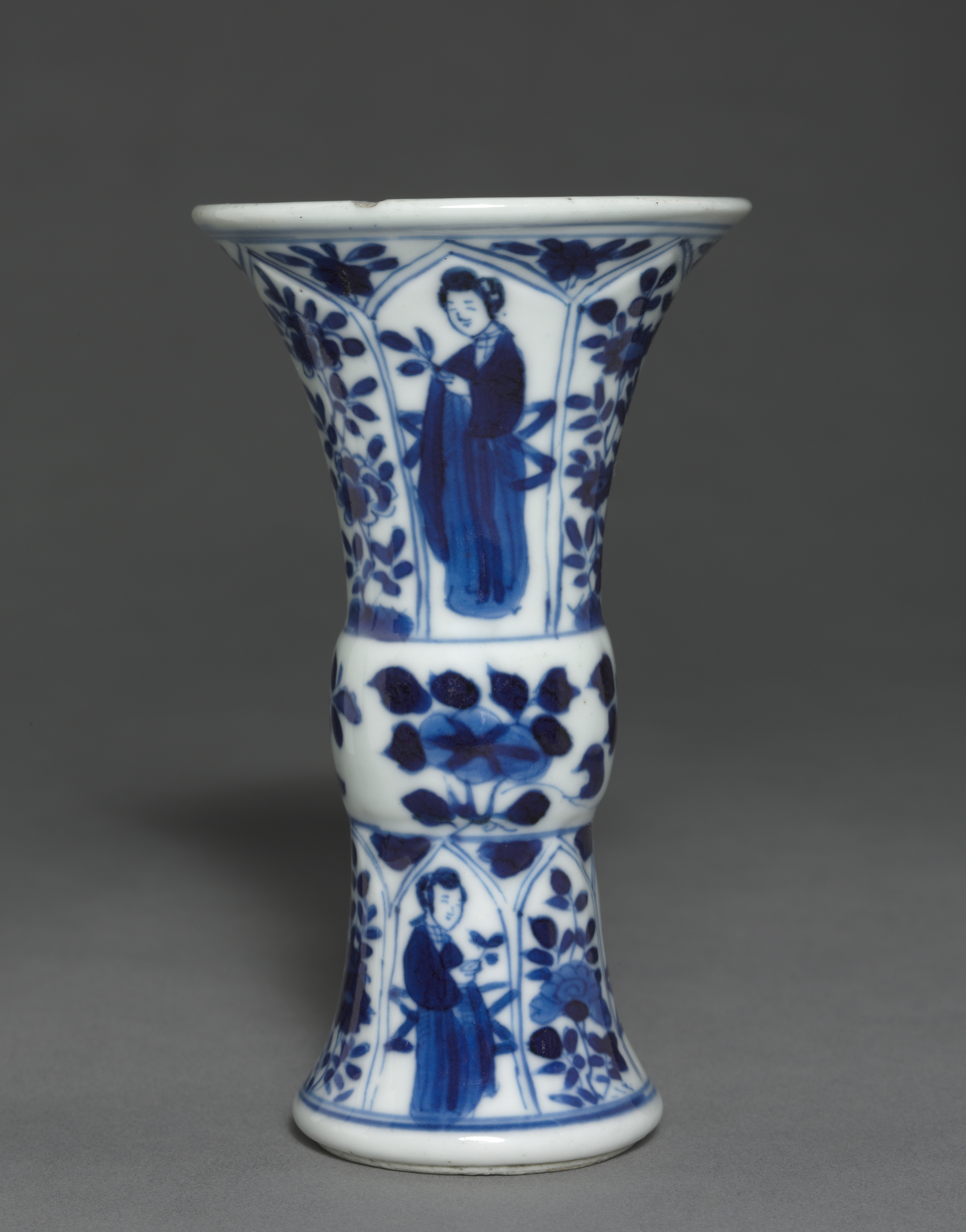 White vase with blue floral designs and people. The vase is shaped like a beaker. The top and bottom are wide and the middle is narrower. The top half and bottom half are divided into two sections by an indented line. The top section contains one image of a woman in a blue dress. The bottom section contains one image of a woman in a blue dress. The background is gray. The title is "Beaker". The artist is unknown.