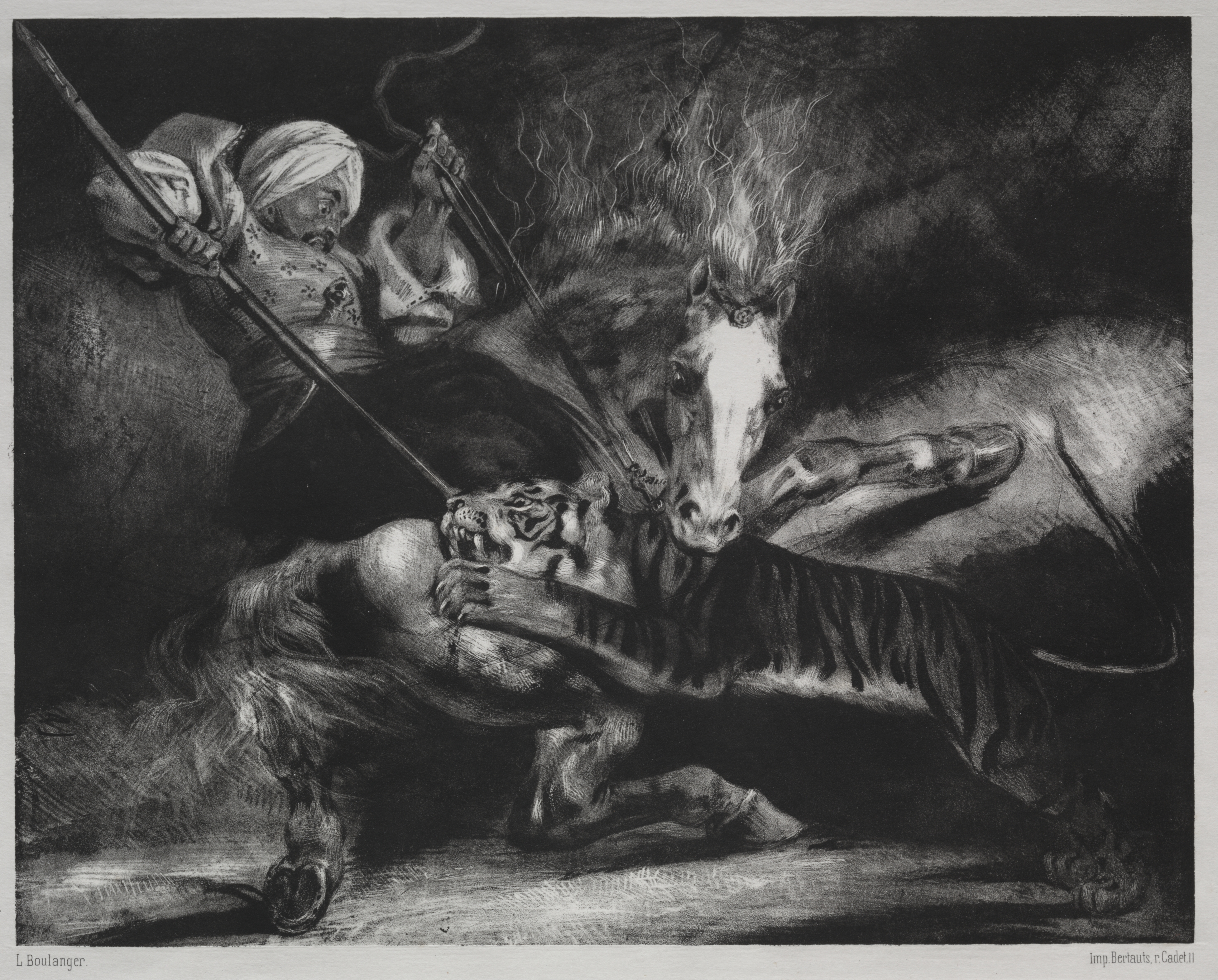 The image depicts a black and white drawing of two people and two animals in a dark setting. The people are on the left side, one behind the other. The person at the back wears a head covering, their face obscured, and holds a long stick or spear. The person in front also wears a head covering; their face is partially visible. They hold a long spear with both hands, and it pierces the body of a tiger below. The tiger lies on its side, with its head facing left and mouth open, revealing teeth. A horse's head and body are to the right of the tiger; the horse appears to be rearing up. The background is dark and shadowy, with some lighter areas suggesting movement or smoke. The overall scene suggests a dramatic and intense moment.