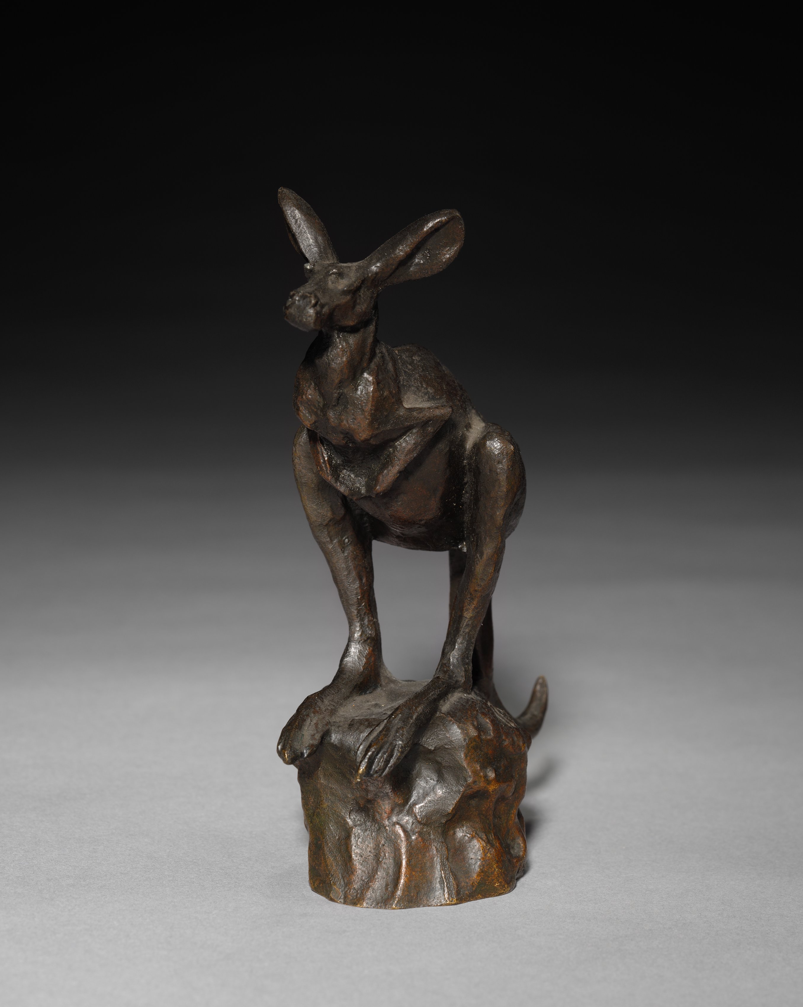 Bronze sculpture of a kangaroo titled "Kangaroo" by artist Degas. The sculpture is dark brown with a reddish tint. The kangaroo is standing on a rock or base, with its front paws resting on the edge. The back legs are muscular and sturdy, with the tail extending behind. The ears are erect and pointed. The background is a gradient from black to gray. The overall mood is one of quiet contemplation, as if the kangaroo is lost in thought.