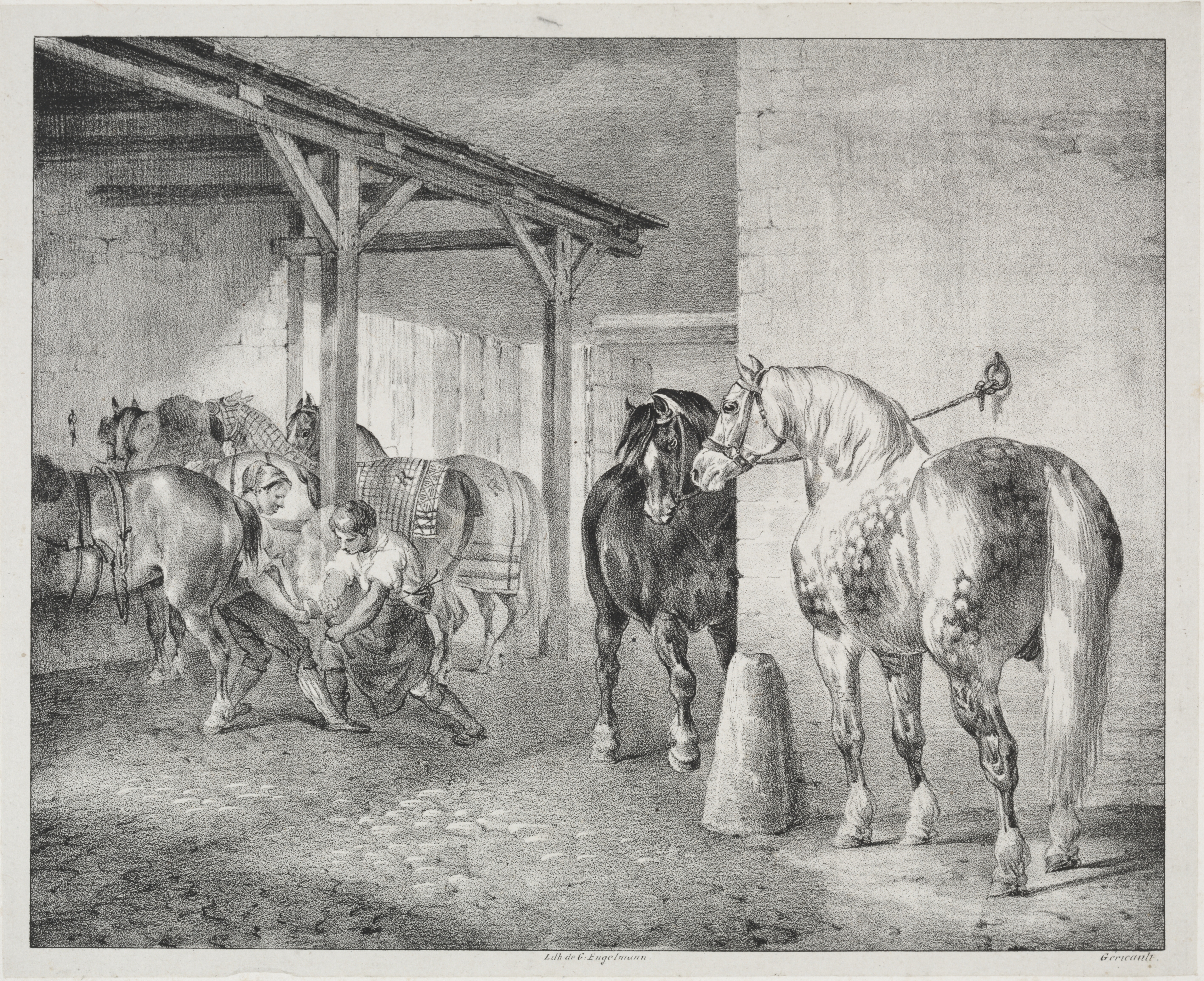 Black and white drawing of a scene. People and horses are in a shed. A woman is bending down behind a horse on the left. A man on the left is tending to another horse on the left. A white horse with a spotted coat faces left with one leg lifted. A dark horse faces right with its head down. There are other horses visible on the left. The background includes a wooden shed structure and a concrete wall.