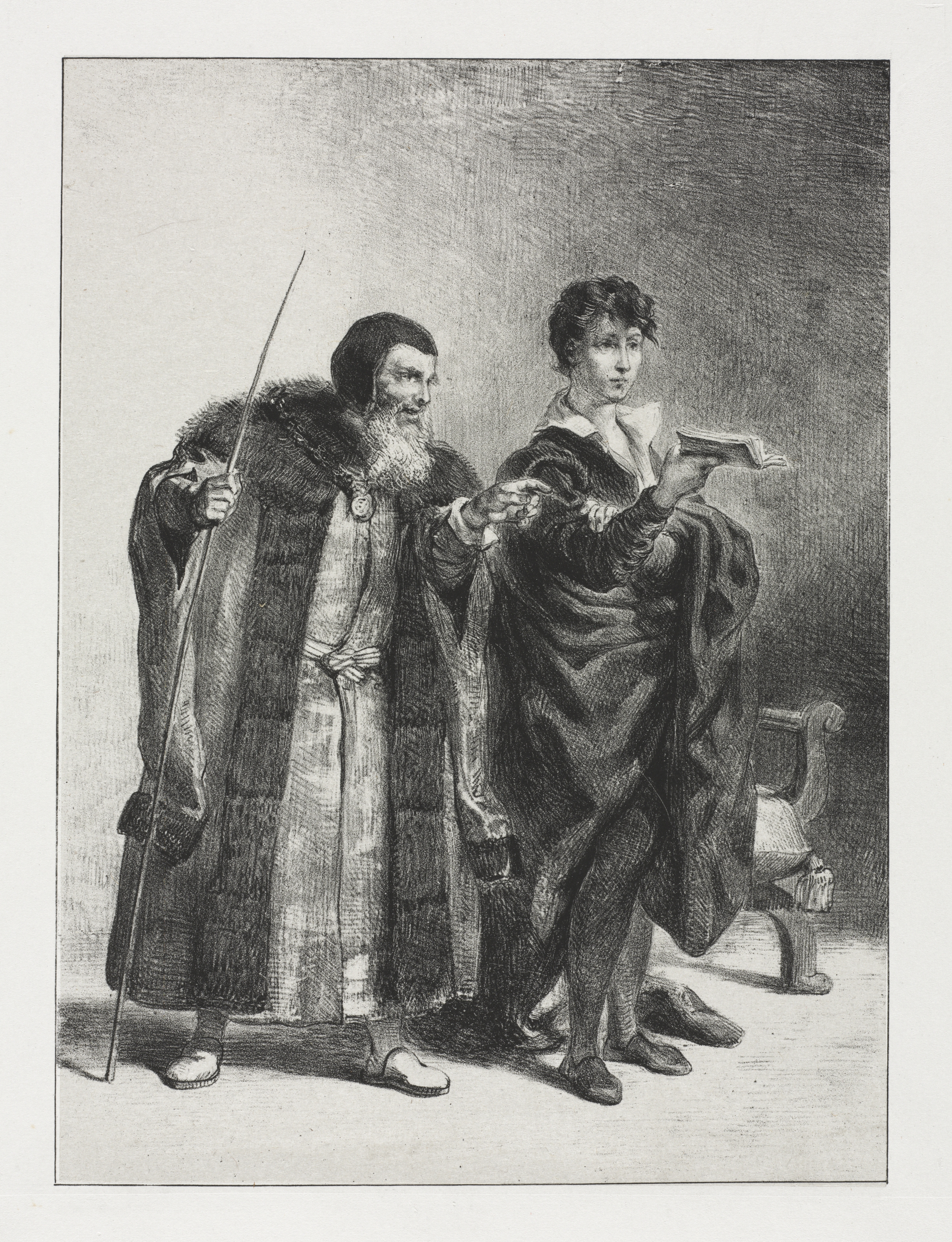 Black and white drawing of two men standing side by side. The man on the left has a long white beard. He wears a long robe with a fur collar, and holds a long staff. The man on the right wears a dark robe over a white collared shirt and holds an open book. A chair is behind them.
