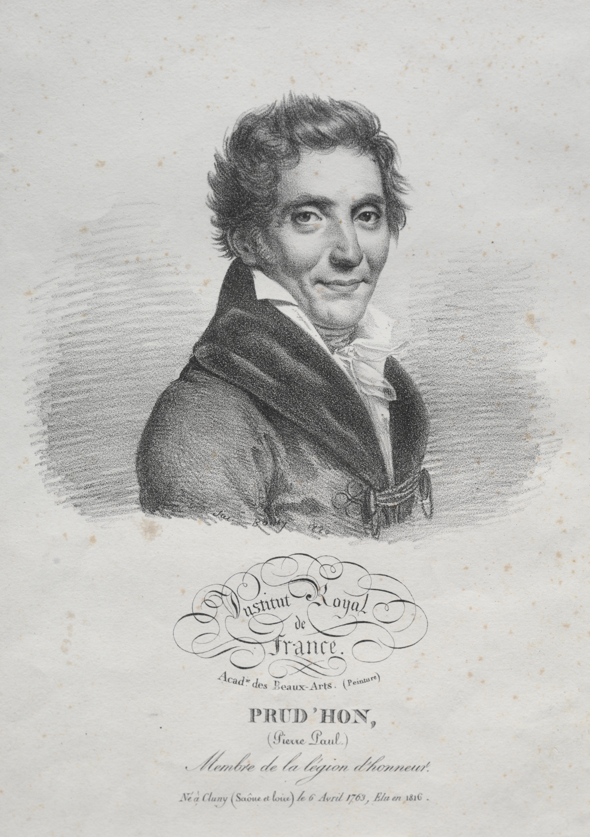Black and white portrait drawing of a man with short, curly hair. The man is wearing a dark jacket with a white collared shirt and a bow tie. A belt with a flower-shaped buckle is around his waist. The background is a shaded oval behind the man's bust. Underneath the portrait is a decorative oval with text inside and underneath it. The text reads "PRUD'HON, (Pierre Paul) Membre de la legion d'honneur: Ne a Cluny (Saone et Loire) le 6 Avril 1768. Mort en 1823." The paper background has brown spots on it.