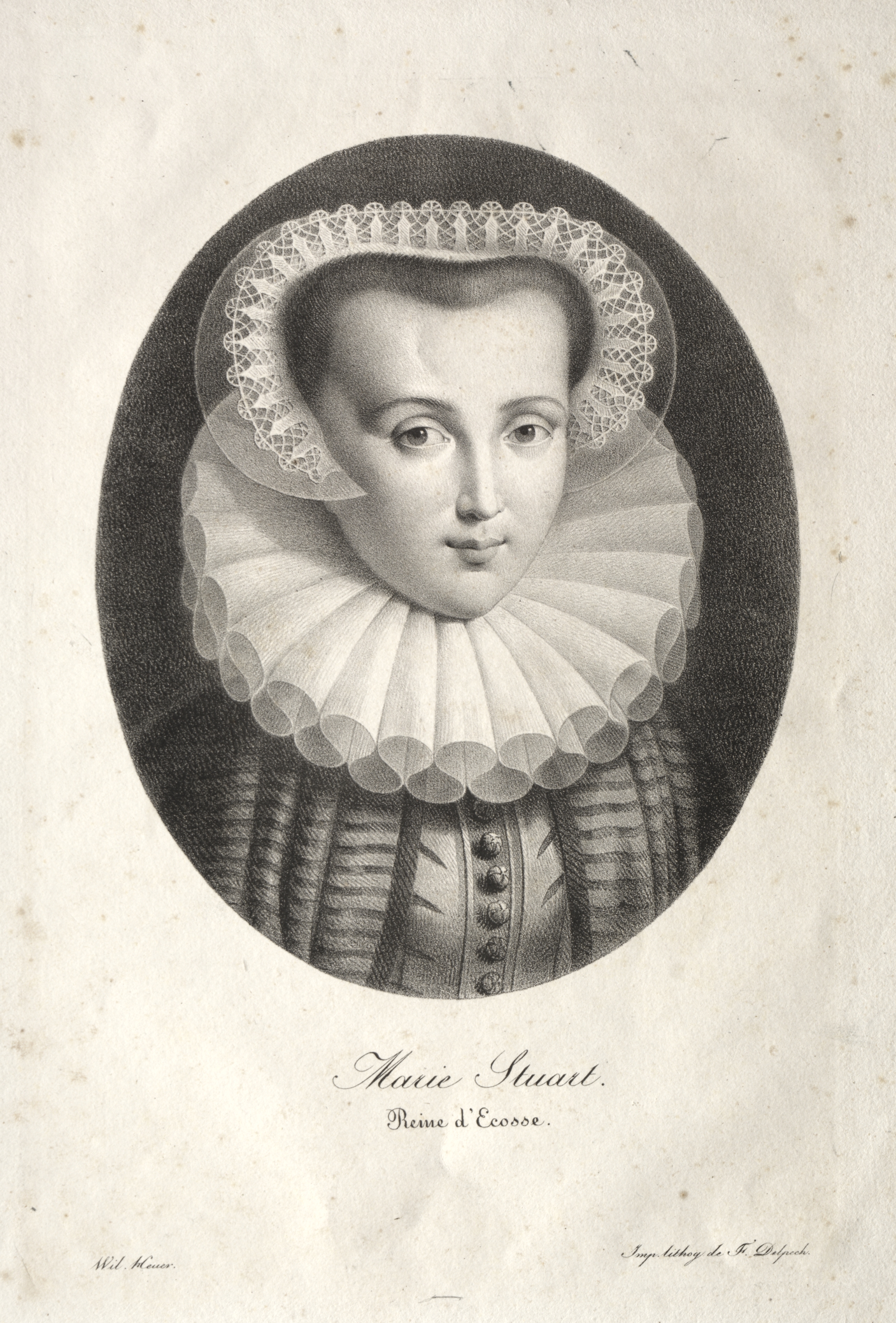 Black and white portrait of a woman wearing a collared ruffled shirt and hat. The woman has a round face, light eyes, and short dark hair. Her hat has a white lace trim. Her collar is gathered and scalloped and her shirt has buttons down the center and horizontal lines across the chest and sleeves. The portrait is oval shaped and on a beige background with darker spots. Below the portrait are two lines of cursive text, the top line reads "Marie Stuart", the bottom line reads "Reine d'Ecosse".