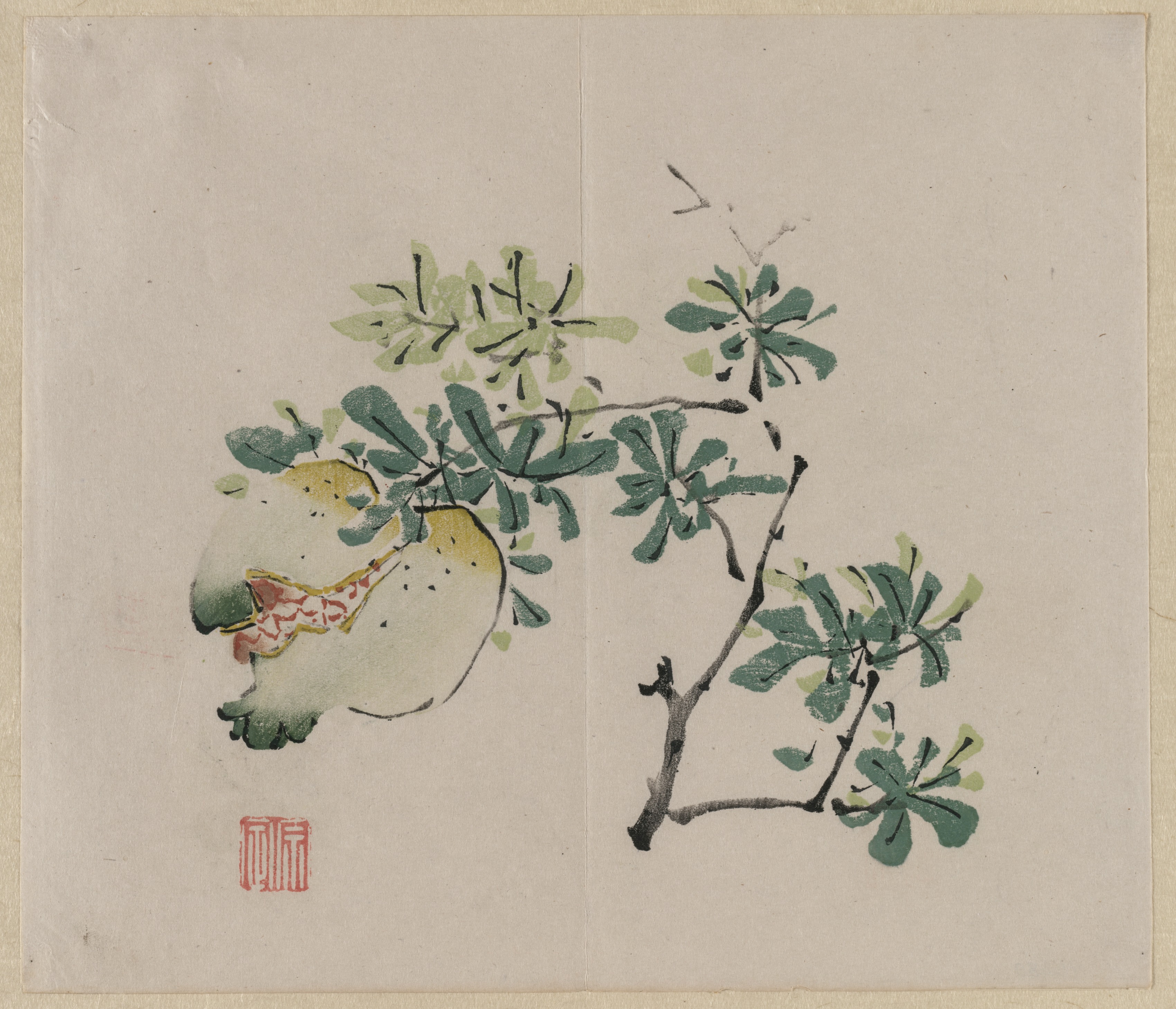 A branch with green leaves and a pomegranate. The pomegranate is white-beige with a yellow top and a patterned section on the side with gold and pink. The background is beige. A small red stamp is on the bottom left. The artwork is by an unknown artist titled "Branch with Pomegranate".