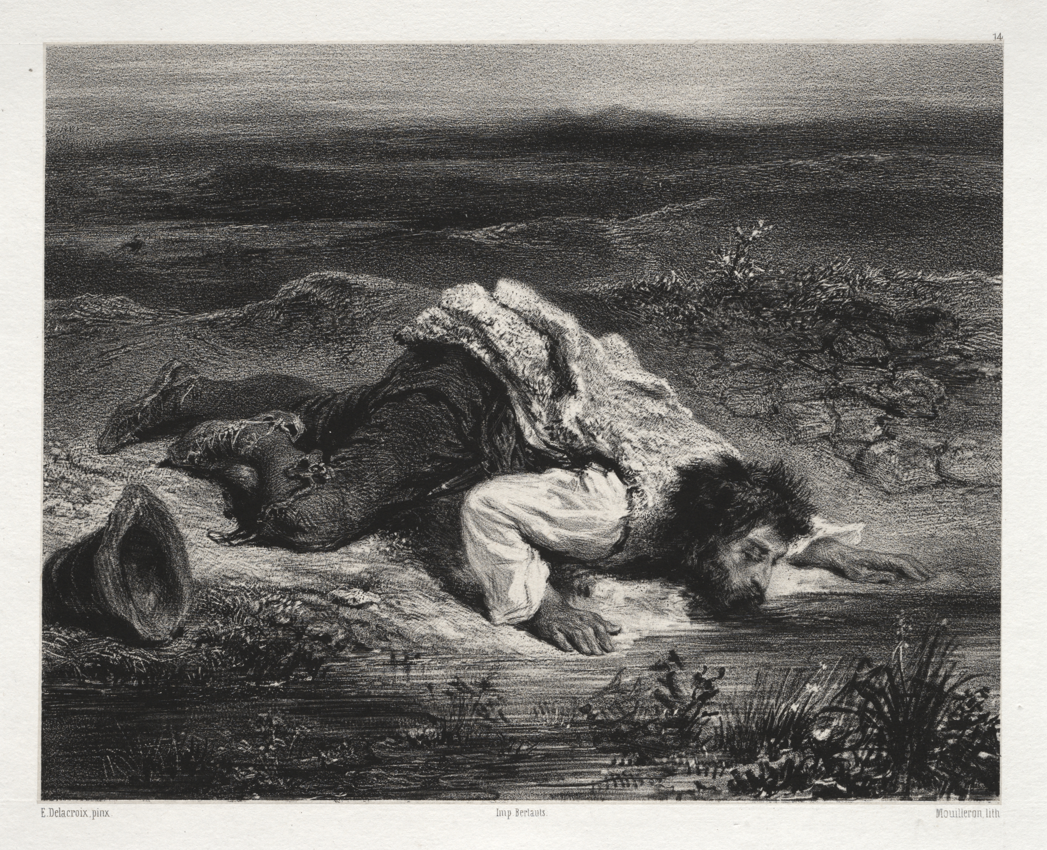 Black and white drawing of a man lying on the ground. The man is on his side with his right arm under his body and his left arm extended. He has a beard and dark hair. He wears a white shirt and dark jacket. A hat lies on the ground next to him. He appears to be in a field or desert with sparse vegetation and a distant horizon.