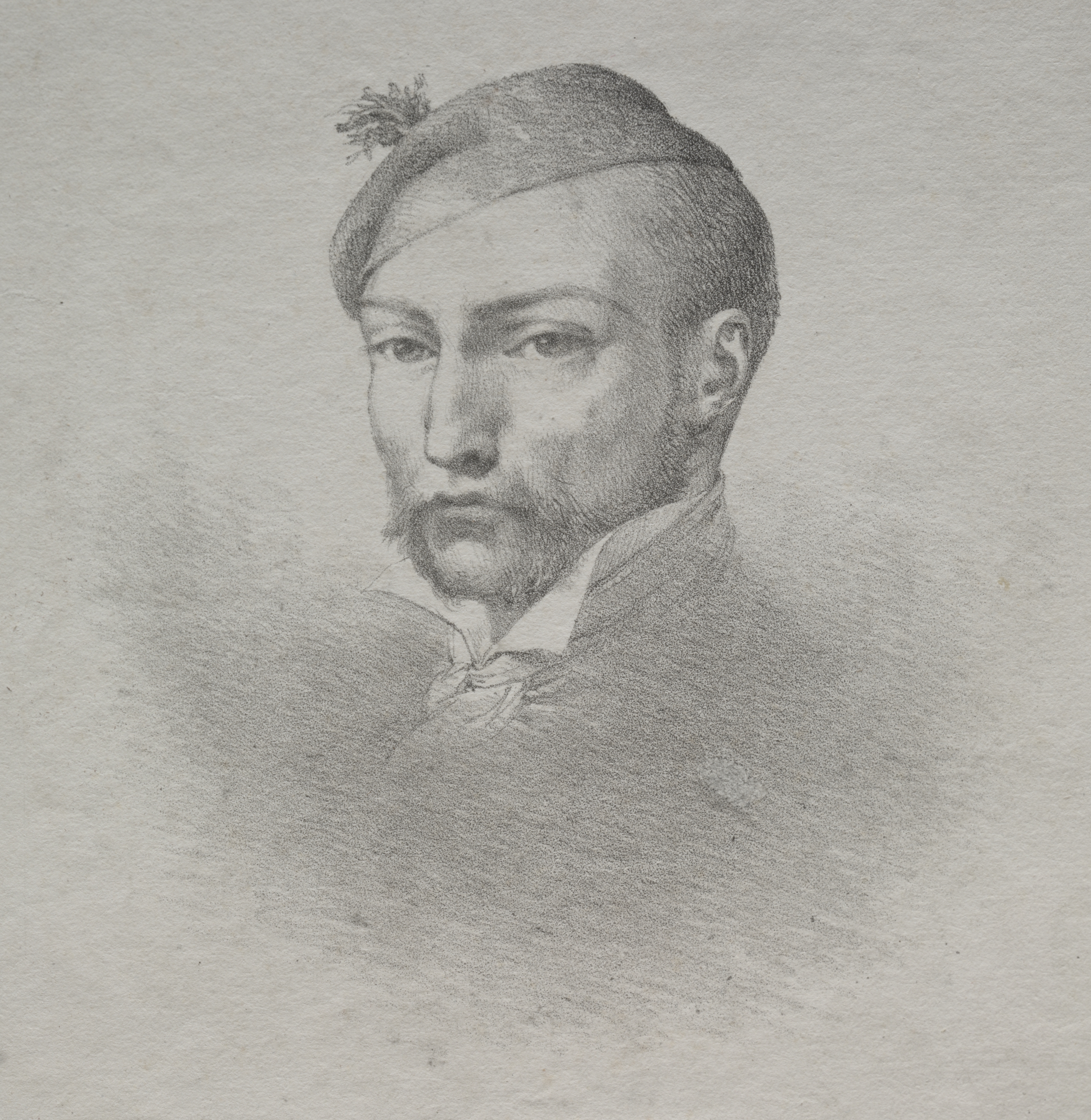 Portrait of a man with short hair and a goatee, wearing a beret with a small tuft or feather on top, and a collared shirt with a tie or scarf; image in shades of gray on a gray background. The man is shown from the chest up, looking slightly to his right. The image is a pencil drawing. The artist is Léon Cogniet and the subject is Théodore Géricault.