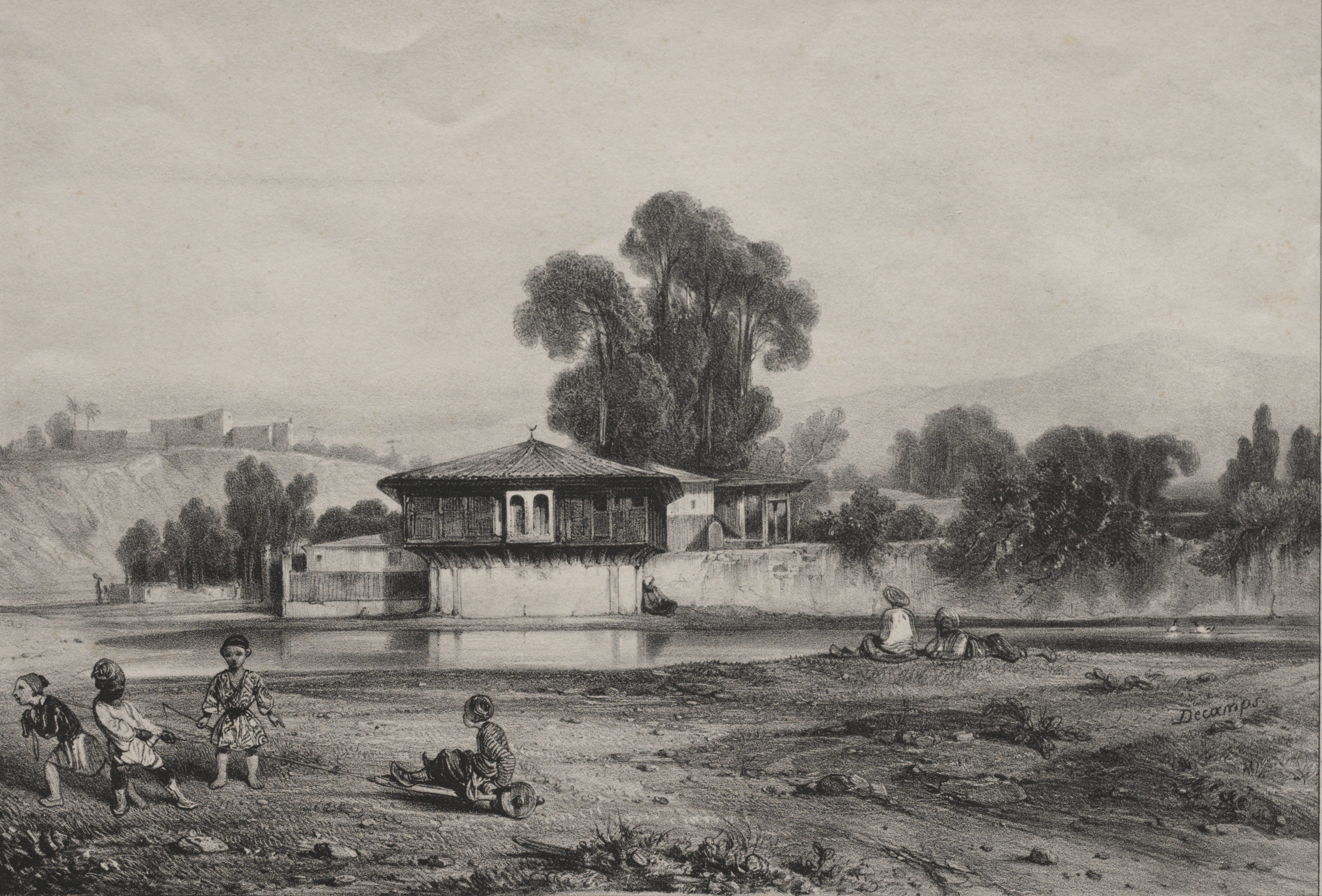 Black and white drawing of a house on the edge of a body of water. The house is on raised foundations. The house is square with a sloped roof and has an enclosed porch with latticed windows. A tree rises behind the house. Four children are playing on the shore in the foreground, with another two sitting down to watch. A rounded hill rises behind the house with a fort on top. There are mountains and trees in the background under a cloudy sky.