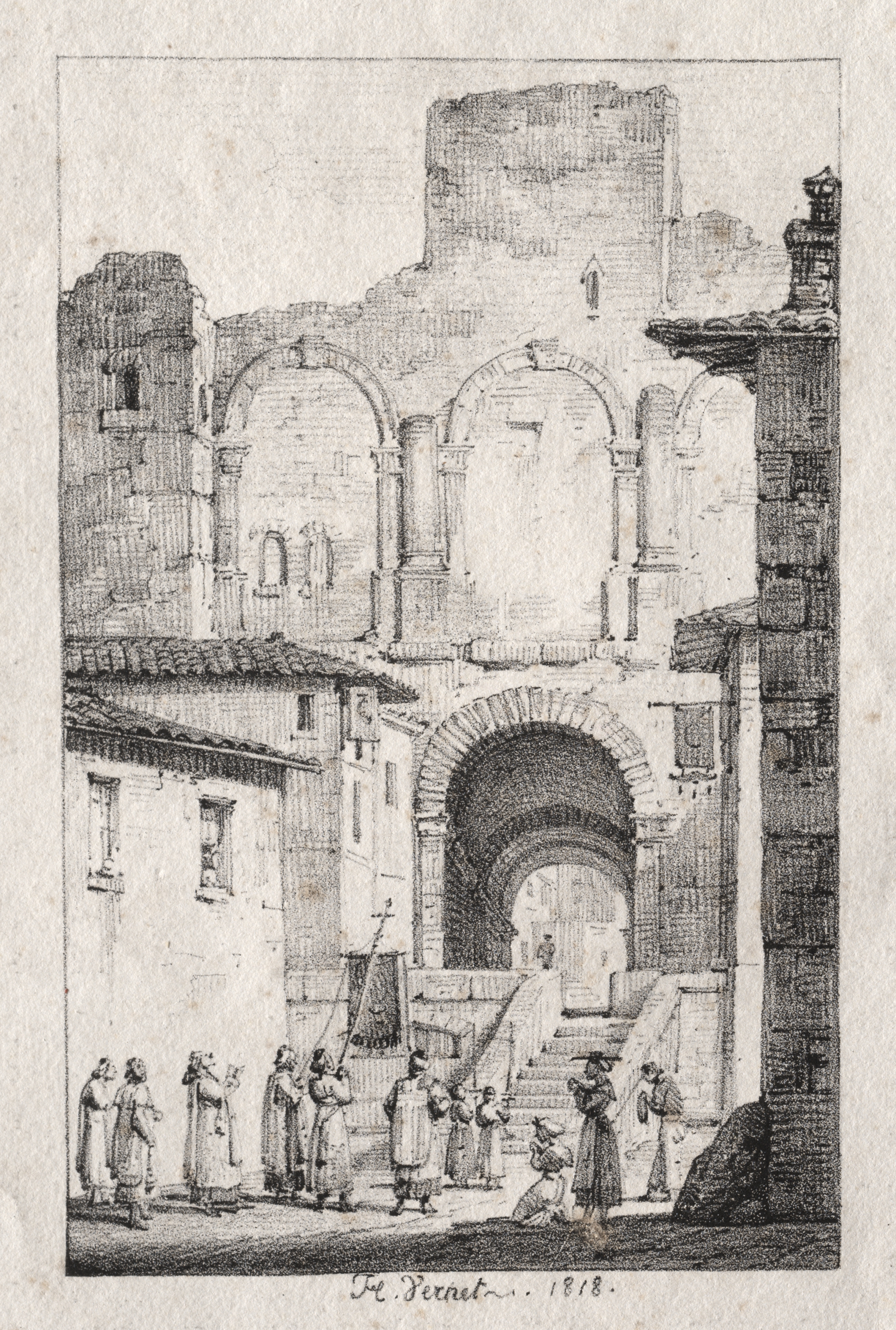 Black and white drawing of a procession in front of old stone buildings. A group of people are walking in a line, some carrying flags or other objects. They are wearing long robes. There is a large stone archway behind them with stairs leading up to another archway. There are more old stone buildings on either side, one with a tiled roof. The drawing is signed "H. Vernet 1818" at the bottom.