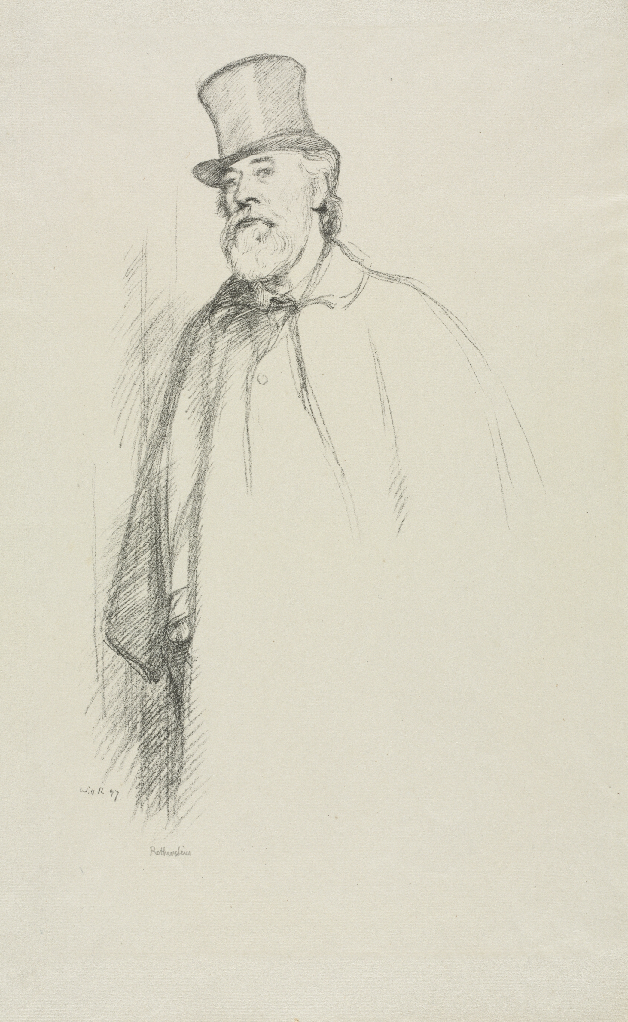 A pencil drawing of a man wearing a top hat. He has white hair and a white beard and moustache. He wears a bow tie. His coat is draped over his right shoulder. The drawing is on light brown paper. The signature appears to read "Rothenstein".