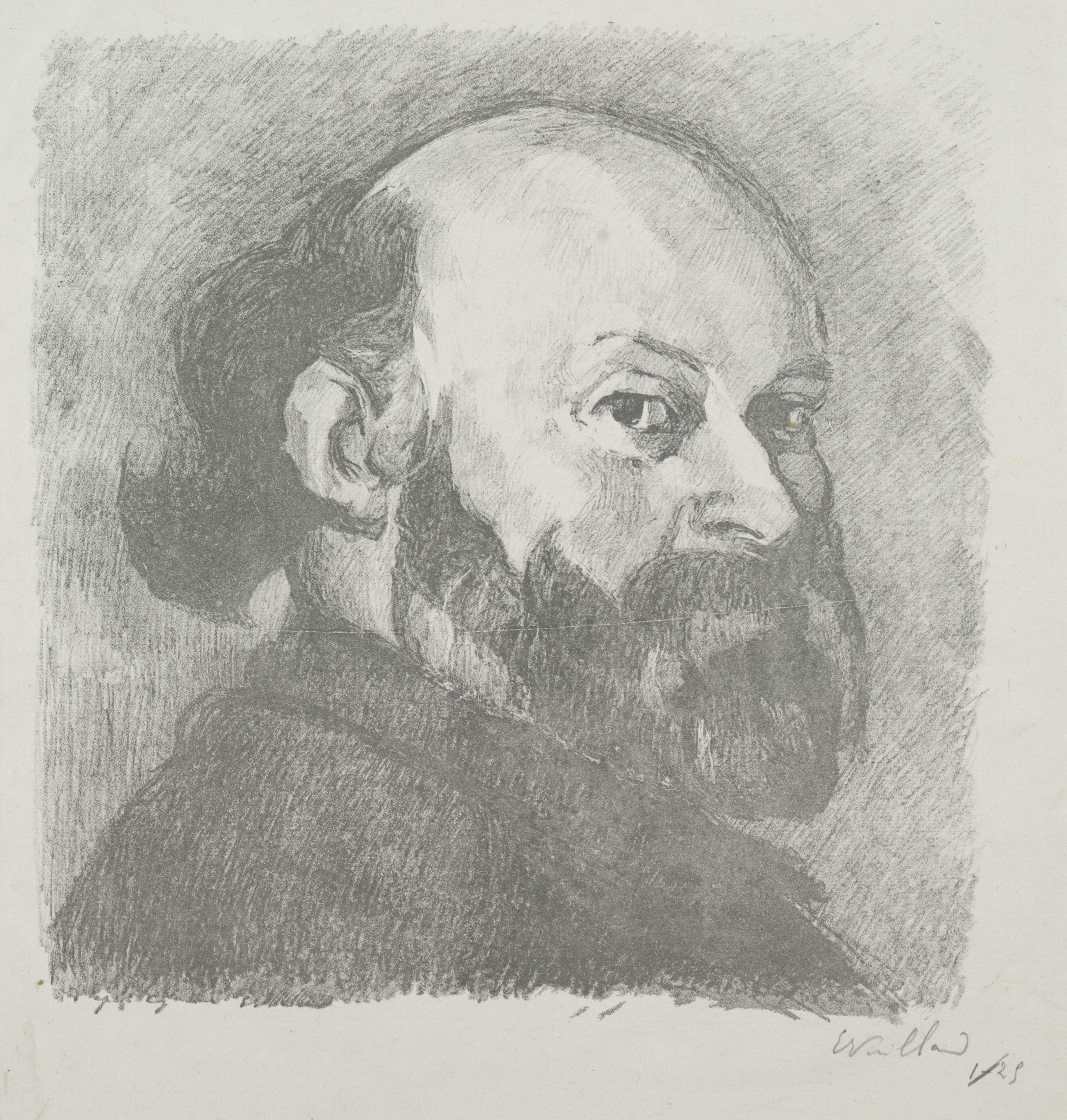 Portrait of a man with a receding hairline, dark hair pulled back behind his ears, and a long dark beard. He wears a dark shirt. The background is shaded gray with diagonal lines. The artist's signature appears in the bottom-right corner. The subject's gaze is to his right. The image is rendered in shades of gray. Paul Cézanne by Edouard Vuillard.