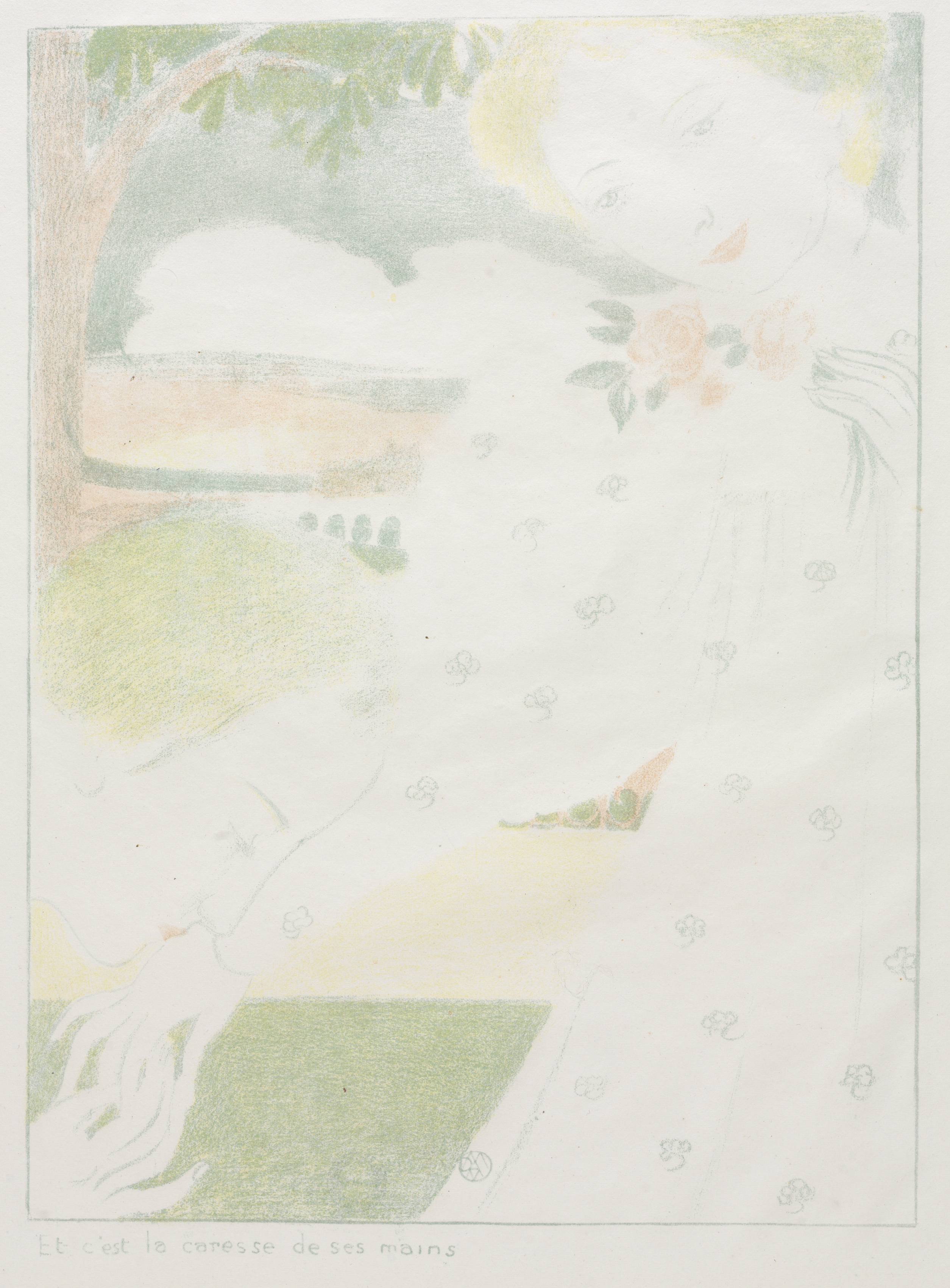The painting depicts a woman with blonde hair, wearing a white dress with a floral pattern, sitting outside. The woman's head is tilted, her chin resting on her right hand; she looks down and to the right. The background features a tree and a grassy area with flowers. The title, "And It is the Caress of their Hands," and the artist, Maurice Denis, are associated with this image. The color palette includes shades of green, yellow, orange, and white. The woman's dress has a subtle floral pattern. The scene appears serene and contemplative.