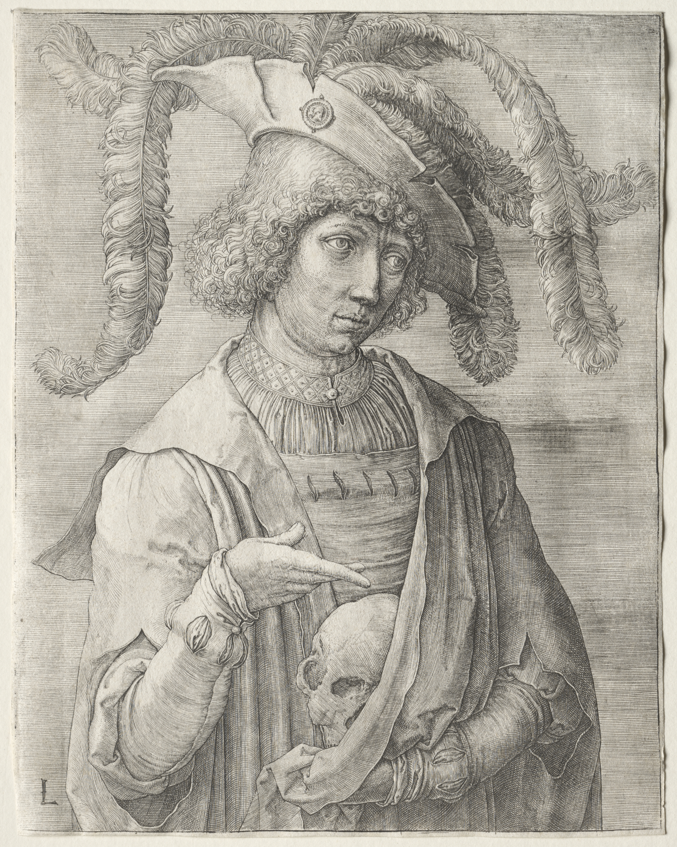 Black and white drawing of a young man with curly hair wearing a hat with long feathers and a cloak over a puffy-sleeved shirt and vest, holding a skull. The man is centered in the frame, looking slightly to his right with a subtle, questioning expression on his face. His curly hair is shoulder-length. He wears a tall hat adorned with a circular emblem and long feathers that curve around his head. The hat has a flat top and a short brim. His attire consists of a high-necked, pleated vest over a puffy-sleeved shirt; a cloak drapes over his shoulders. The cloak appears to be wrapped around his body. His right hand is extended, palm up, and his left hand grasps a human skull at chest level. The background is plain with subtle shading. The drawing style is detailed and realistic with varying line densities creating texture and depth.