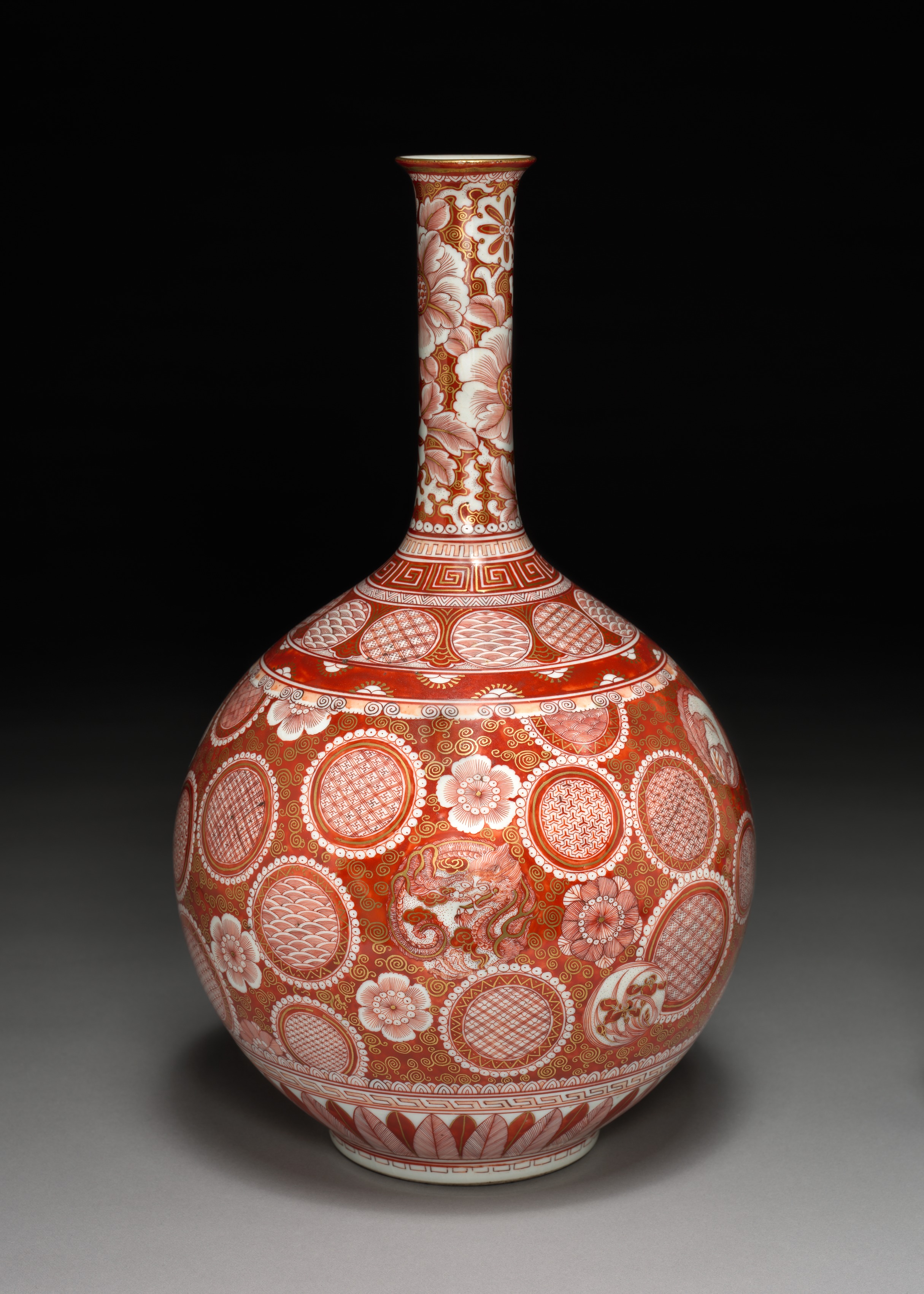 The vase, by artist Kondo Bunkichi, features a bulbous body with a narrow neck and flared mouth. The body is predominantly red-orange with white designs. The designs include various patterns such as circles, flowers, and a dragon. The neck has a floral pattern. The background is black to gray gradient. The vase appears to be ceramic.