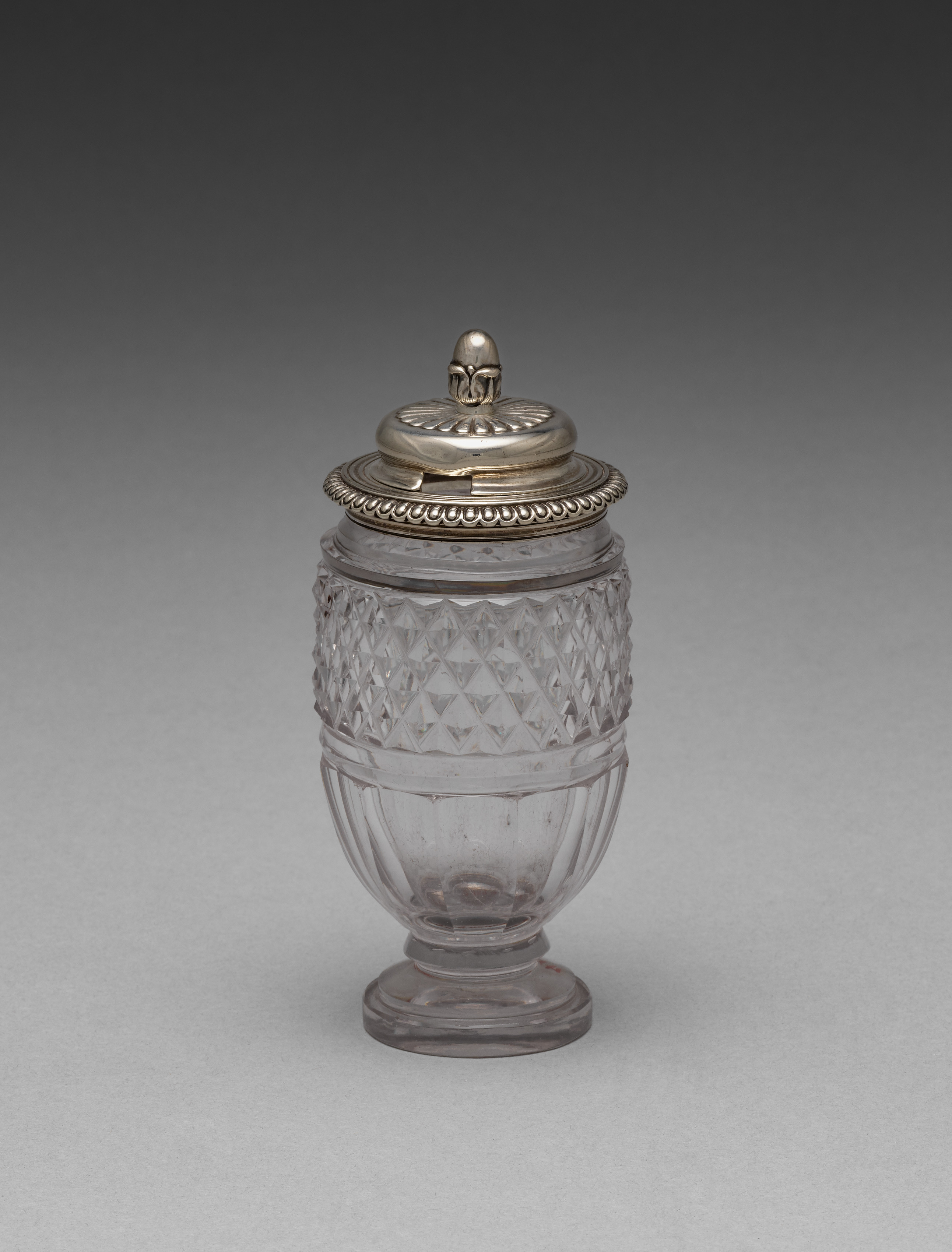 Clear glass jar with a wide mouth, a short neck, and a rounded body. The jar has a diamond-cut pattern around the top half and vertical ridges on the bottom half. A silver lid with a decorative edge and a small finial on top. The lid is placed on the jar. The background is gray, getting darker towards the top.