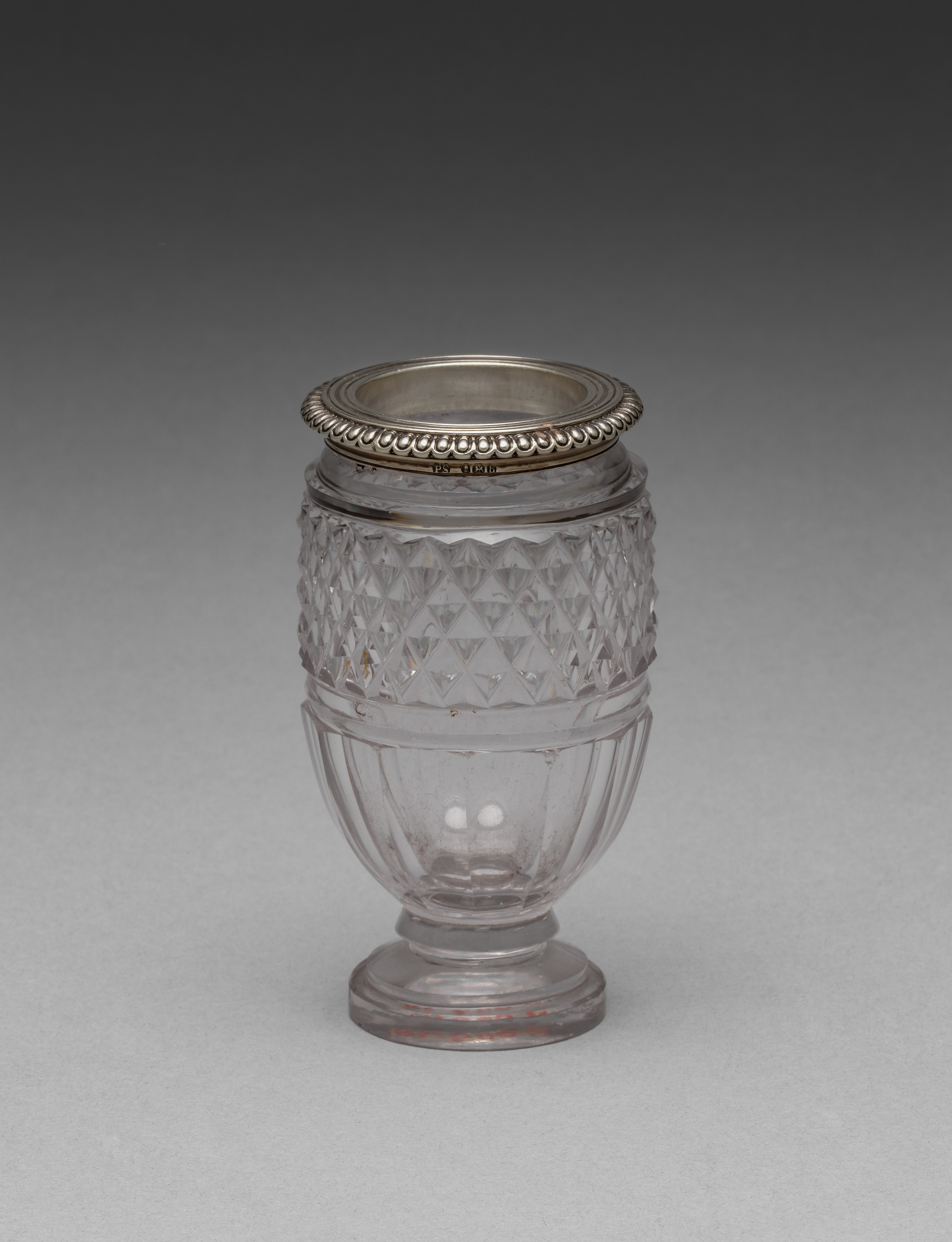 The image shows a clear glass goblet or vase with a silver rim titled "Pot (2 of 2)" by an unidentified artist. The goblet has a wide mouth and a narrow base. The top portion of the goblet is clear glass with a diamond-shaped pattern. Below the patterned section is a clear glass section with vertical lines. The base of the goblet is clear glass with a ridged edge. The rim of the goblet is silver with a decorative edge. The background of the image fades from dark gray at the top to light gray at the bottom.
