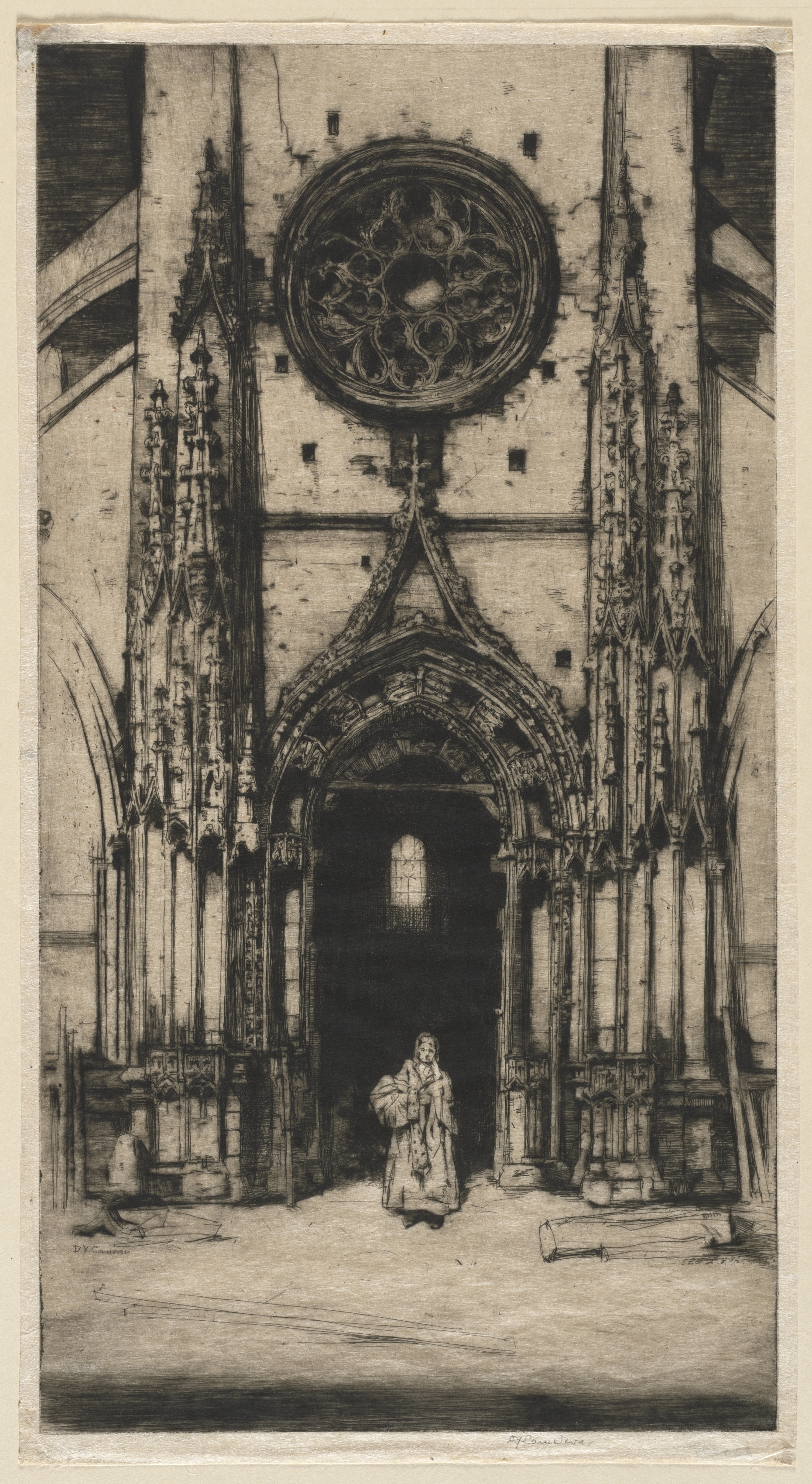 Black and white etching of a figure standing in the interior of a Gothic church. The figure is centered in the lower portion of the image, dressed in long robes. The church features a large ornate circular window above a pointed arch doorway. The doorway and window are flanked by tall, thin columns with intricate carvings. The image has a border around it.