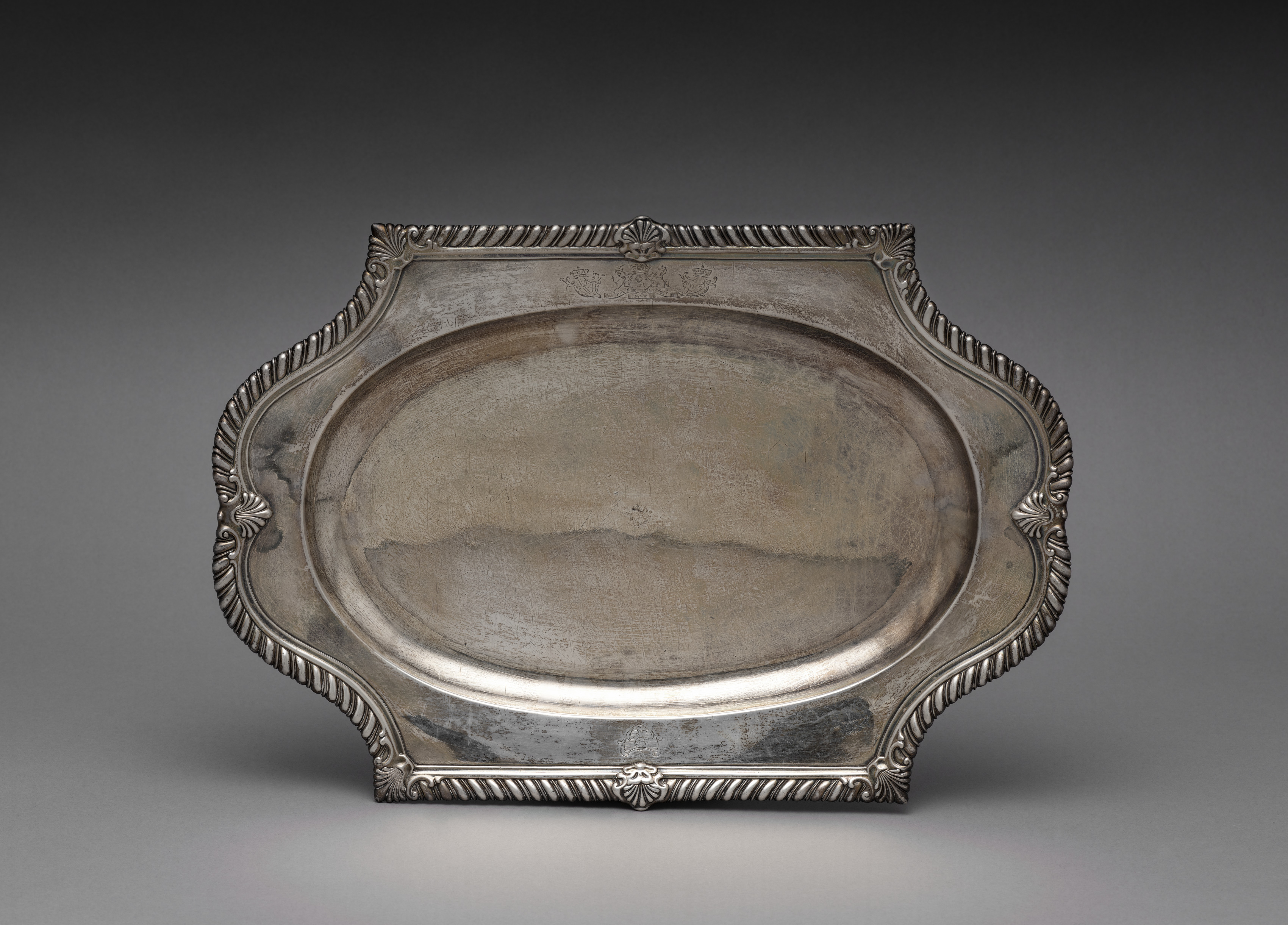 The silver tray has a rounded square shape. The tray's center is recessed and circular. The tray's corners are rounded. The edges of the tray are decorated with a border of twisted rope-like design ending in spiral shell-like motifs at the corners. There are similar shell-like motifs on the sides. The background is a gray gradient transitioning from dark on top to light on the bottom. The image shows a light source coming from the bottom.