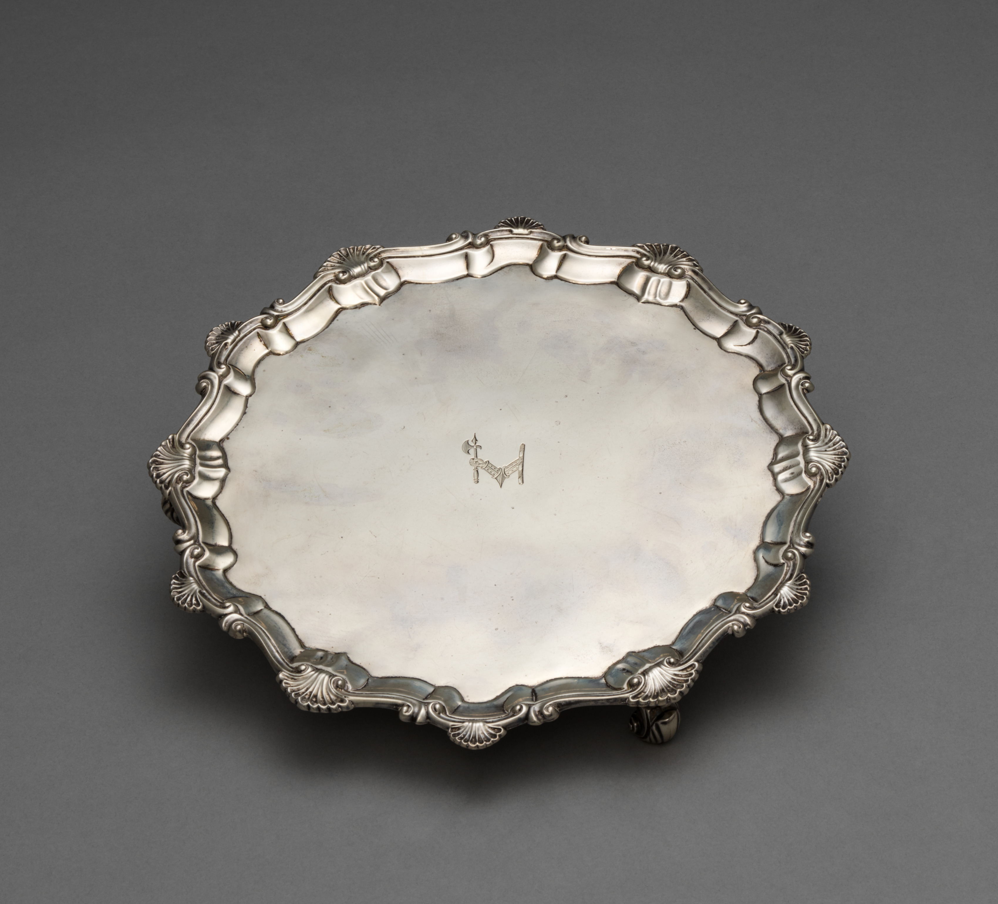 The Salver by Ebenezer Coker is a silver tray with a scalloped edge. The tray has a flat, round body with a raised, ornate border around the edge. The border features a repeating pattern of curved shapes resembling shells or leaves. The tray has three feet on the bottom. The surface of the tray is marked with a small engraving in the center. The background of the image is dark gray, and the tray casts a slight shadow.