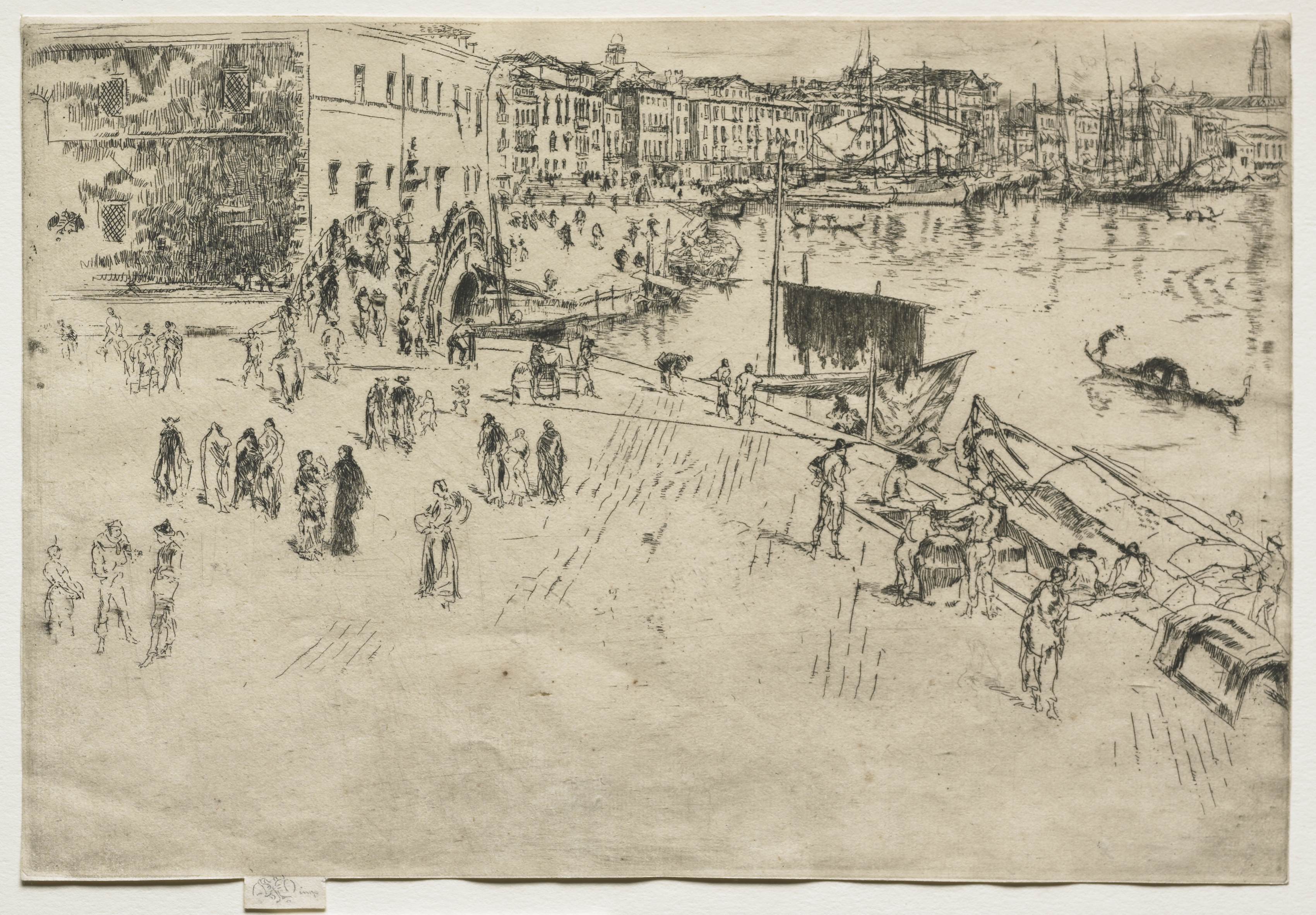 The Riva, No. 1 by James McNeill Whistler. A black and white sketch on beige paper depicts a waterfront scene. A bridge is on the left and sailboats are on the right. Buildings line the waterfront. People walk on a paved area. Boats are on the water. A pole with a flag is on the right. Ripples are on the water. A boat is near the right edge. The artwork's edges are rough. A small piece of paper with writing is on the bottom.