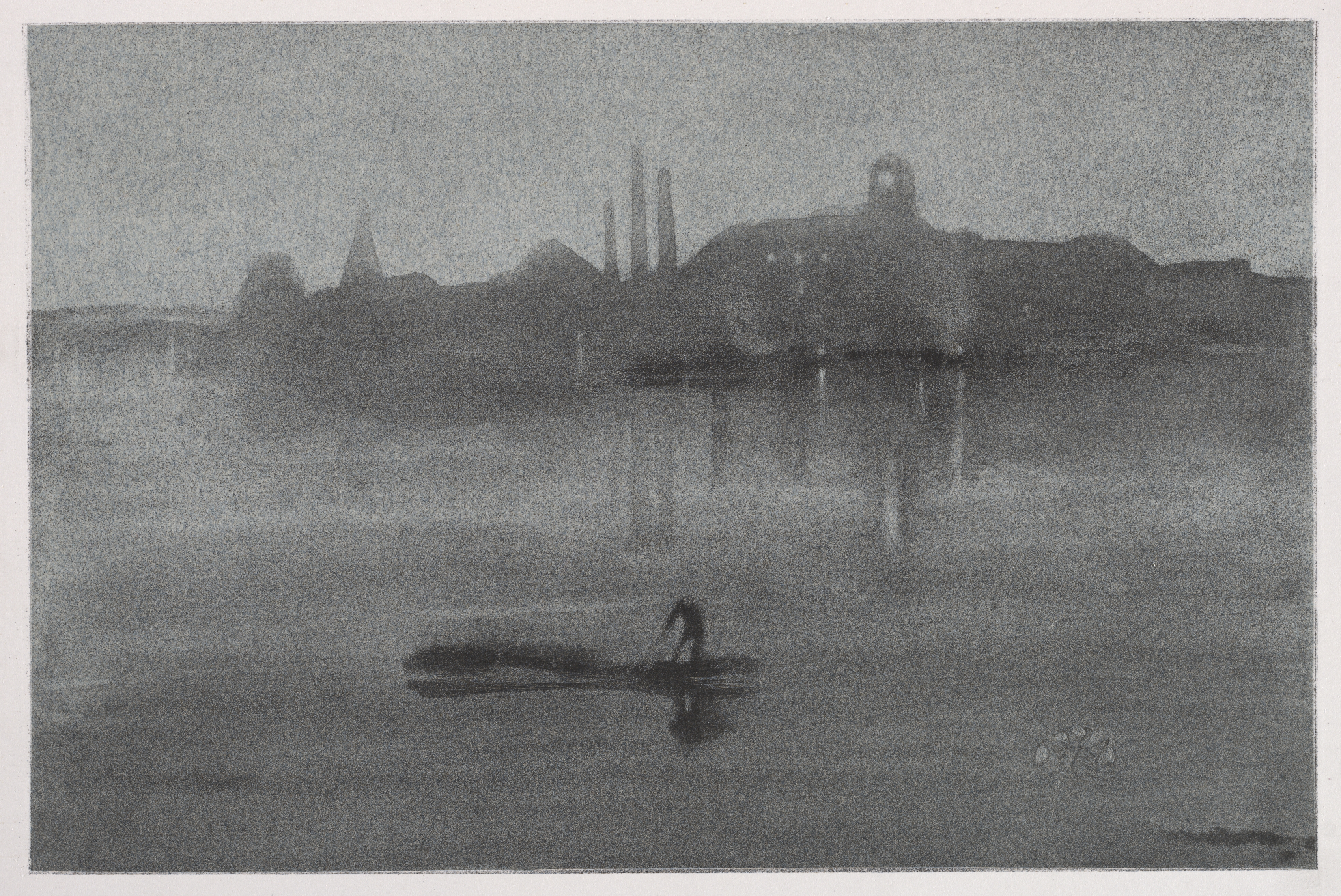 The painting depicts a landscape with a body of water in the foreground and a cityscape or industrial area in the background. The artwork, titled "Nocturne," is by James McNeill Whistler. The body of water occupies the lower half of the painting and reflects the scene above it. A small boat with one person is in the water closer to the viewer. The background shows a dark silhouette of buildings with several tall, thin structures that appear to be chimneys. The sky above is uniformly gray and light. The entire scene is depicted in various shades of gray, with no other colors visible.