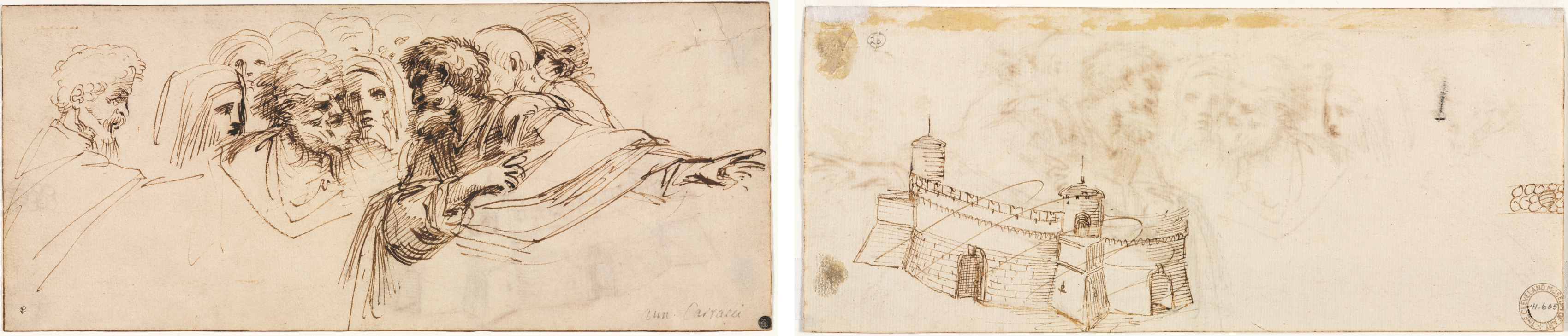 The image shows two sketches on aged paper. The left sketch depicts multiple human heads and one full figure; the heads are drawn in various angles and expressions, while the figure appears to be wearing a robe. The right sketch depicts a fortress with crenelated walls and towers. Both sketches are rendered in brown ink. The paper has darker brown spots and lighter brown areas. There are stamps and writing on both sketches. The sketches appear to be side by side with a small gap between them. The left sketch is more detailed and darker than the right sketch. The right sketch has faint pencil marks. The paper has a yellowish tint.